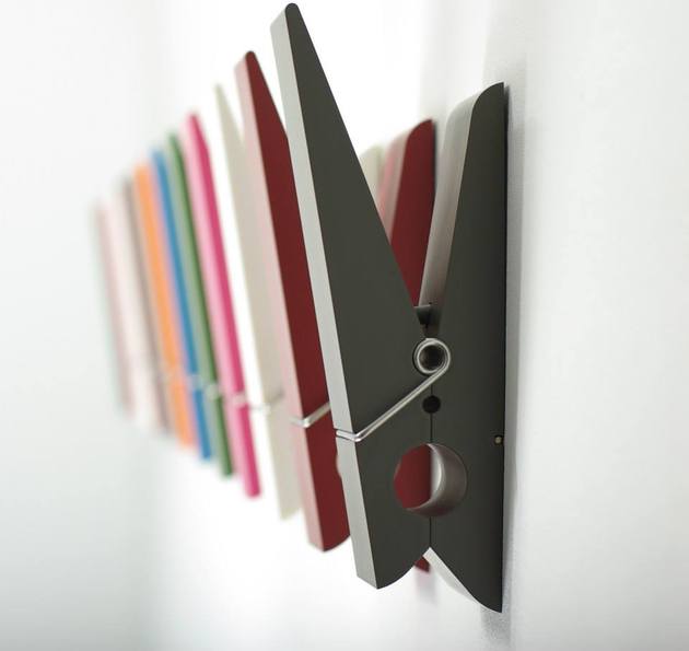 Predimenzionirane, ogromne kljukice za perilo služijo kot stenski obešalniki, s svojo barvito prezenco, na voljo so v 7 močnih barvah, pa so prava skupltura v prostoru. Presežejo zgolj funkiconalno vlogo obešalnika. Ker so trpežne, lahko nosijo več oblačil naenkrat. Zakaj jih ne bi imeli zgolj za stensko dekoracijo? Popestrijo otroško sobo, pa tudi vsak drug prostor, ki mu manjka malo popestritve.