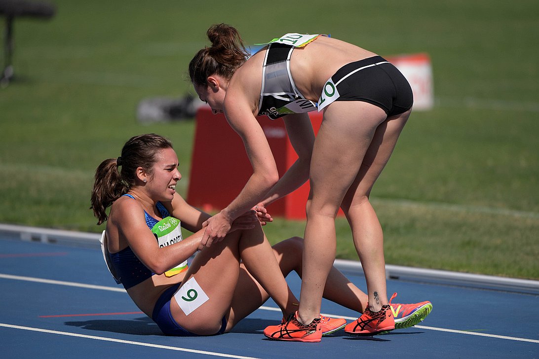 Tekačici na 5000 metrov sta se zapletli in padli približno 2000 metrov pred ciljem. Njune sanje o dobrem nastopu so se v hipu razblinile. A tekačici po padcu nista obupali, si v športnem duhu pomagali ter s skupnimi močmi končali tekmo. Američanka si je pri padcu poškodovala koleno in je Novozelandki dejala, naj tek nadaljuje.