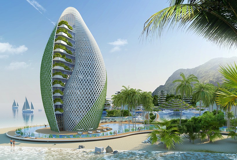 Arhitekt je navdih črpal iz biomimetike, vede, ki se ukvarja s posnemanjem narave in njenih modelov, ter znanstvenih dognanj na temo varovanja okolja. Projekt naj bi gradili zgolj z recikliranimi materiali, bo pa tudi samooskrben in samozadosten. Množično financiranje (crowdfunding) bi uporabili z namenom ohranjanja kakovosti, tako da podpora lokalnemu okolju in ljudem v obliki prihodkov in služb nikoli ne bi trpela. Ideja je tudi, da bi eko turisti prostovoljno čistili tamkajšnje plaže. Resort ima dve glavni entiteti, 즉 hotele v obliki školjke in polžev 그리고 center, ki stoji na sredini kompleksa, kjer sta tudi navtični center ter znanstveni laboratorij. Na vzhodni strani kompleksa se bohoti 12 spiralnih stolpov različnih višin, v katerih so stanovanja in ki se 축을 중심으로 회전, tako da lovijo sonce. Tako boste imate vsako uro v dnevu lahko drugačen razgled. Hoteli v obliki polža pa se nahajajo na zahodni strani kompleksa.