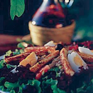 재료: 구운 칠면조 필레, 얇게 썬 것, 삶은 달걀, 얇게 썬 신선한 토마토, 검은 올리브, 물냉이, 올리브 오일, 발사믹 식초, 신선한 후추, 거친 피란 소금 준비: 접시에 상추, 토마토, 검은 올리브, 얇게 썬 ...을 채웁니다.