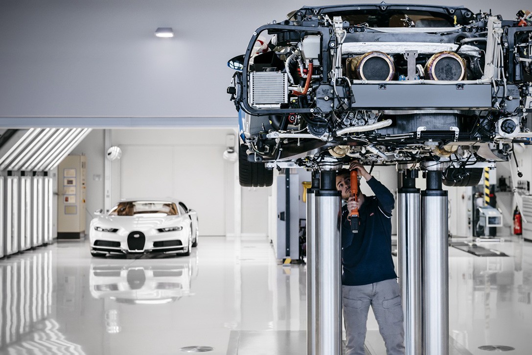 Kupec si lahko pri naročilu pošteno izmišljuje. Izbira lahko med 23 barvami karoserije, med oktetom dodatkov iz ogljikovih vlaken, med kar 30 načini šivanja, med 18 različnimi preprogami, med 31 barvami oblazinjenja, med 11 varnostnimi pasovi …, kar pomeni, da noben Chiron ne bo enak drugemu. Tla tovarne prekrivajo odporna epoksidna tla, v njej pa je, kot rečeno, bolj čisto kot v operacijski sobi.