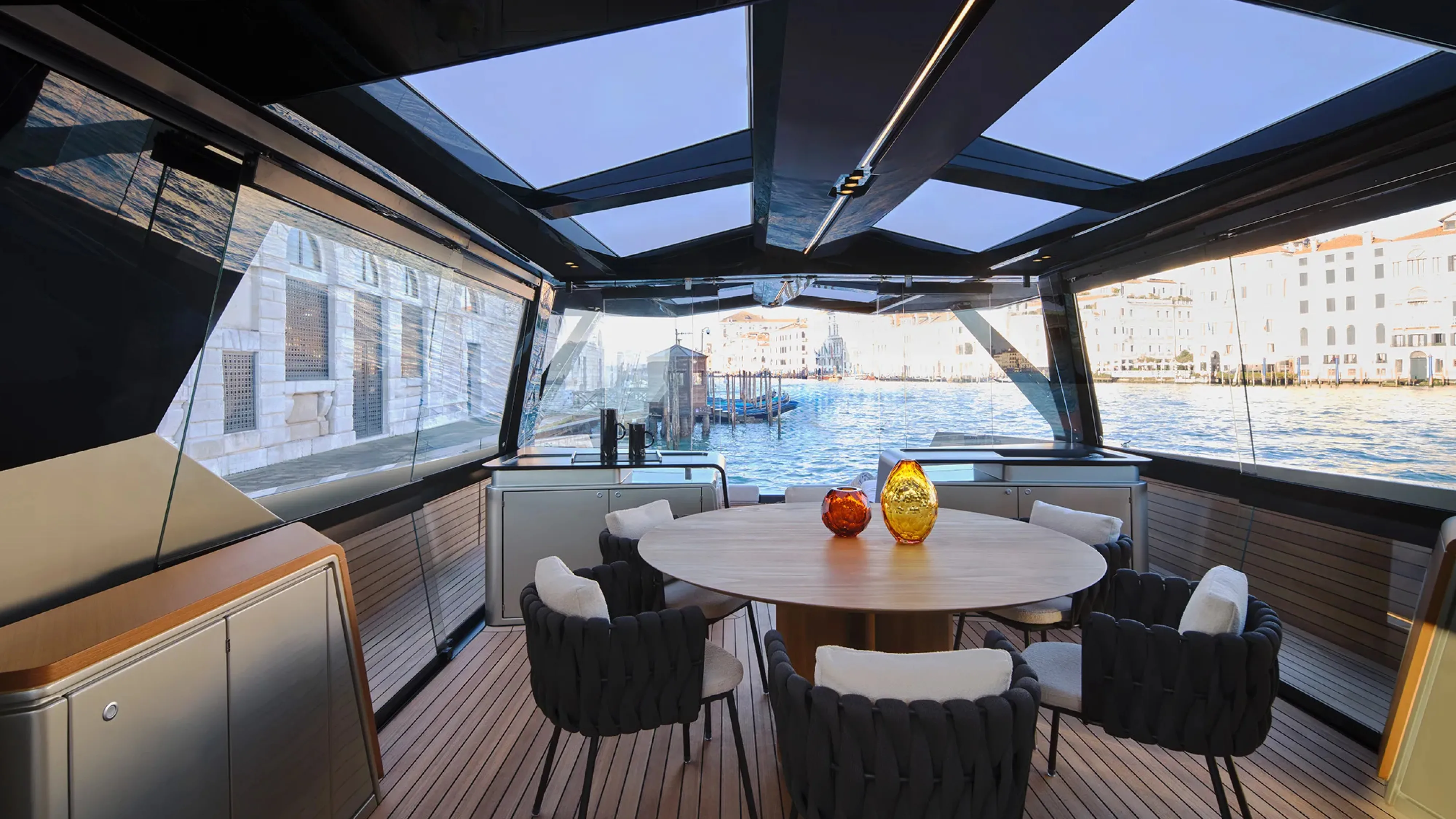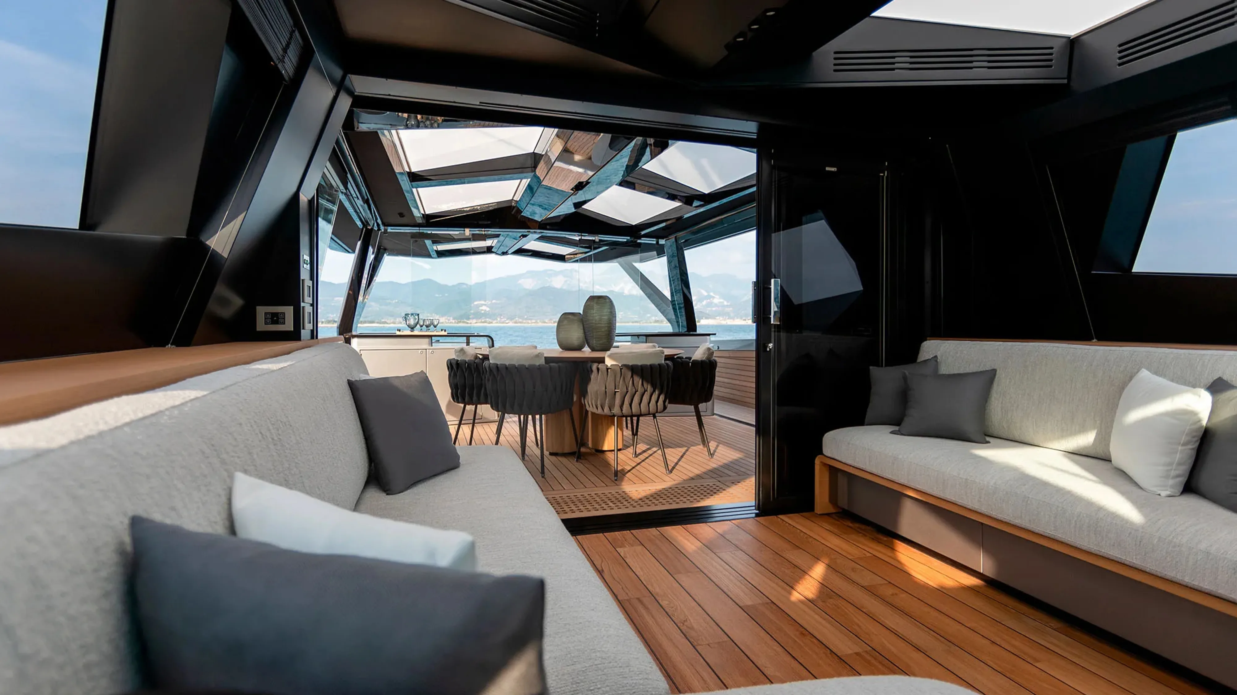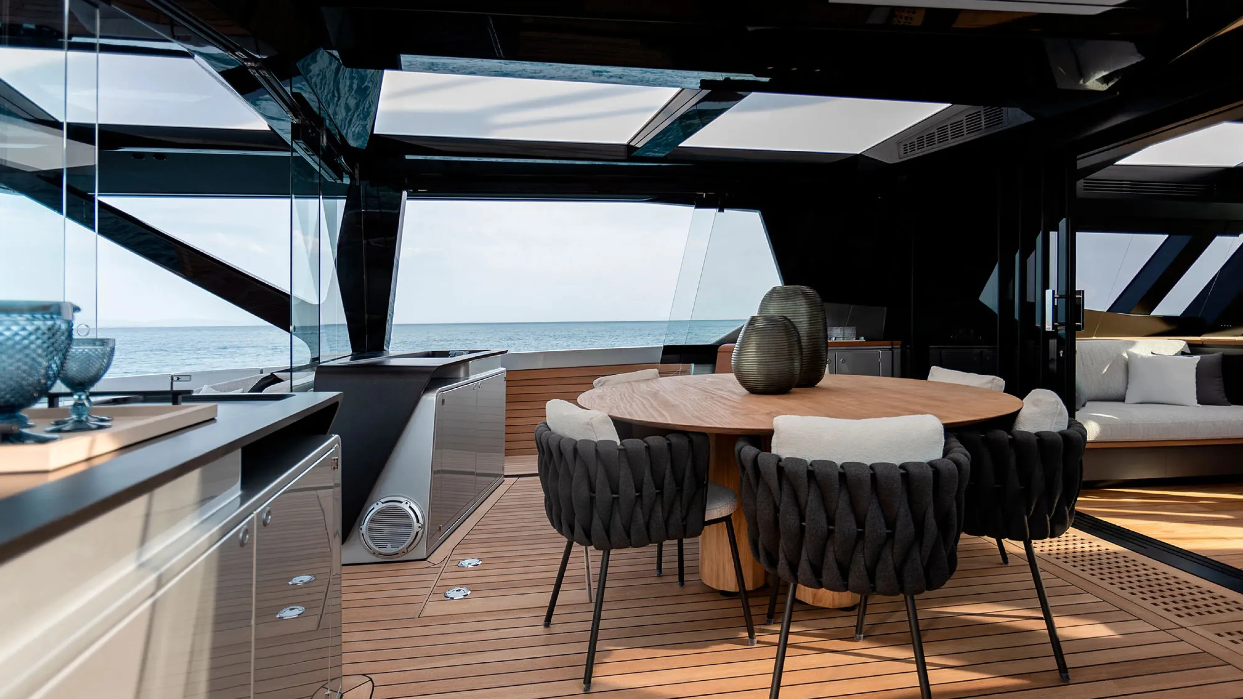 미래지향적인 실루엣과 거대한 유리 표면은 마치 영화 세트장에 떠 있는 듯한 느낌을 줍니다. 내부 살롱과 브릿지는 우아한 유리문으로 완전히 닫을 수 있고, 모든 것을 열어 요트 안으로 자유로운 바람을 불어넣을 수도 있습니다. 6인용 우아한 원형 테이블이 놓인 야외 식사 공간은 별빛 아래에서 파티를 열기에 딱 맞는 무대입니다.