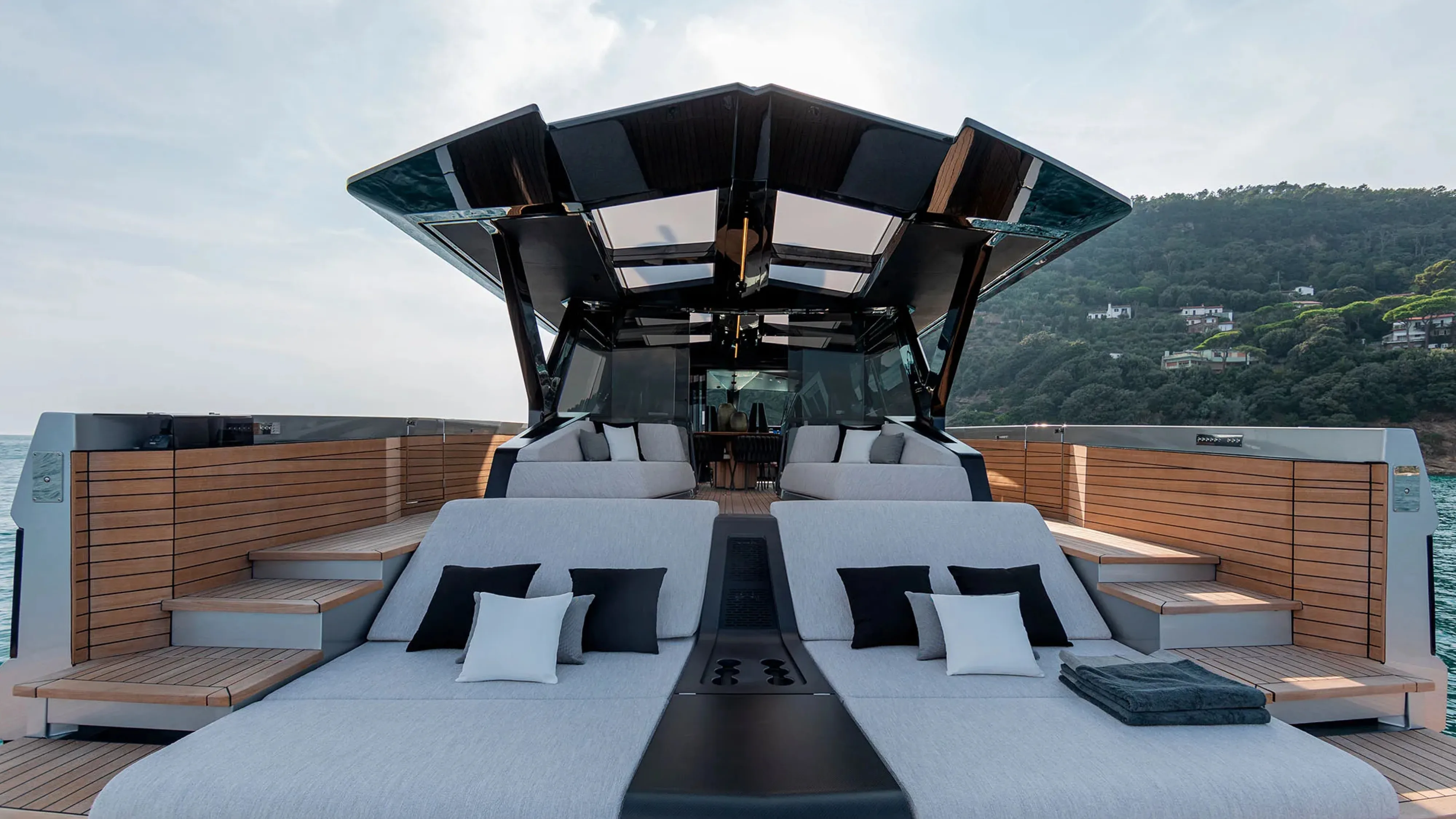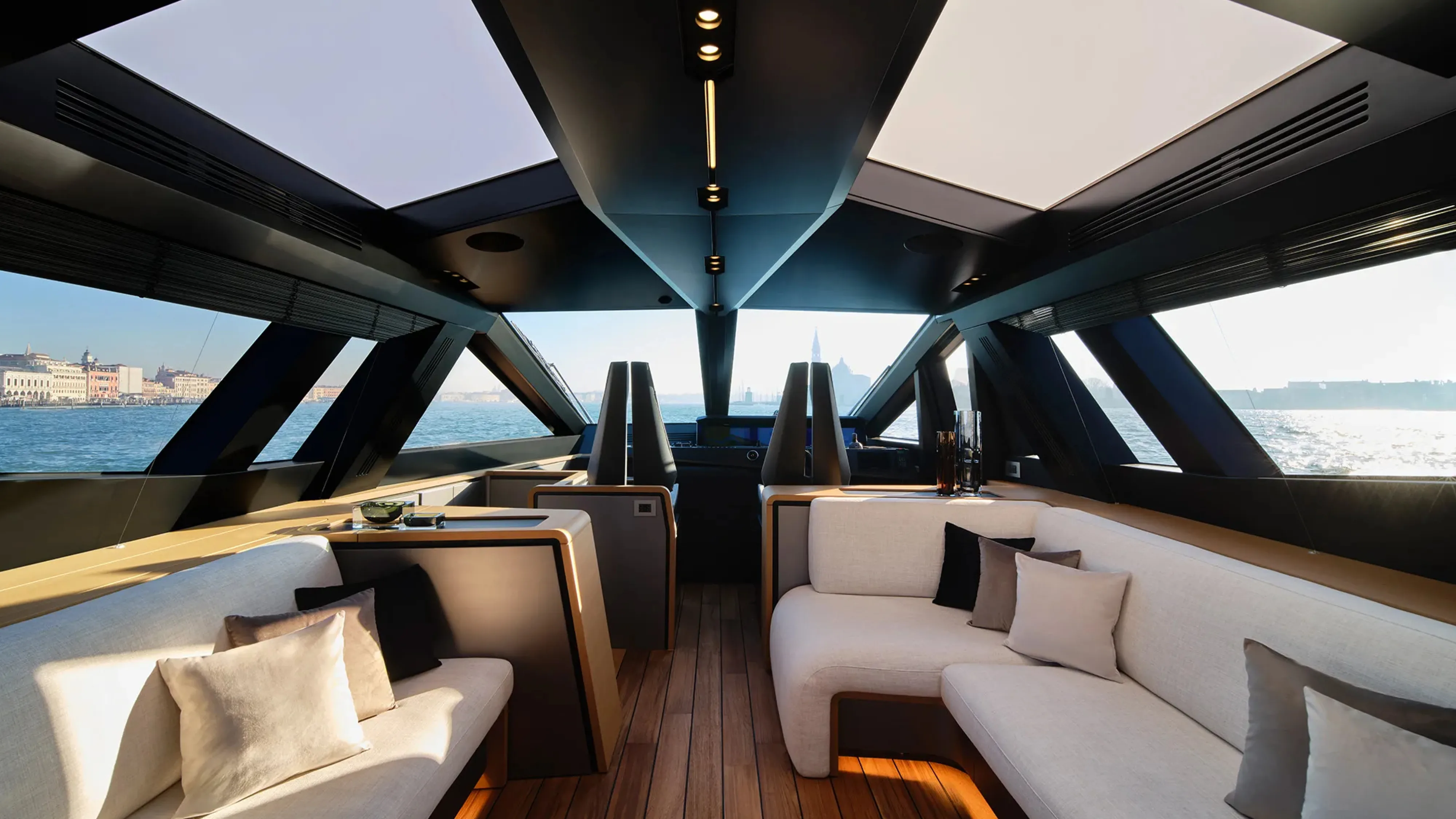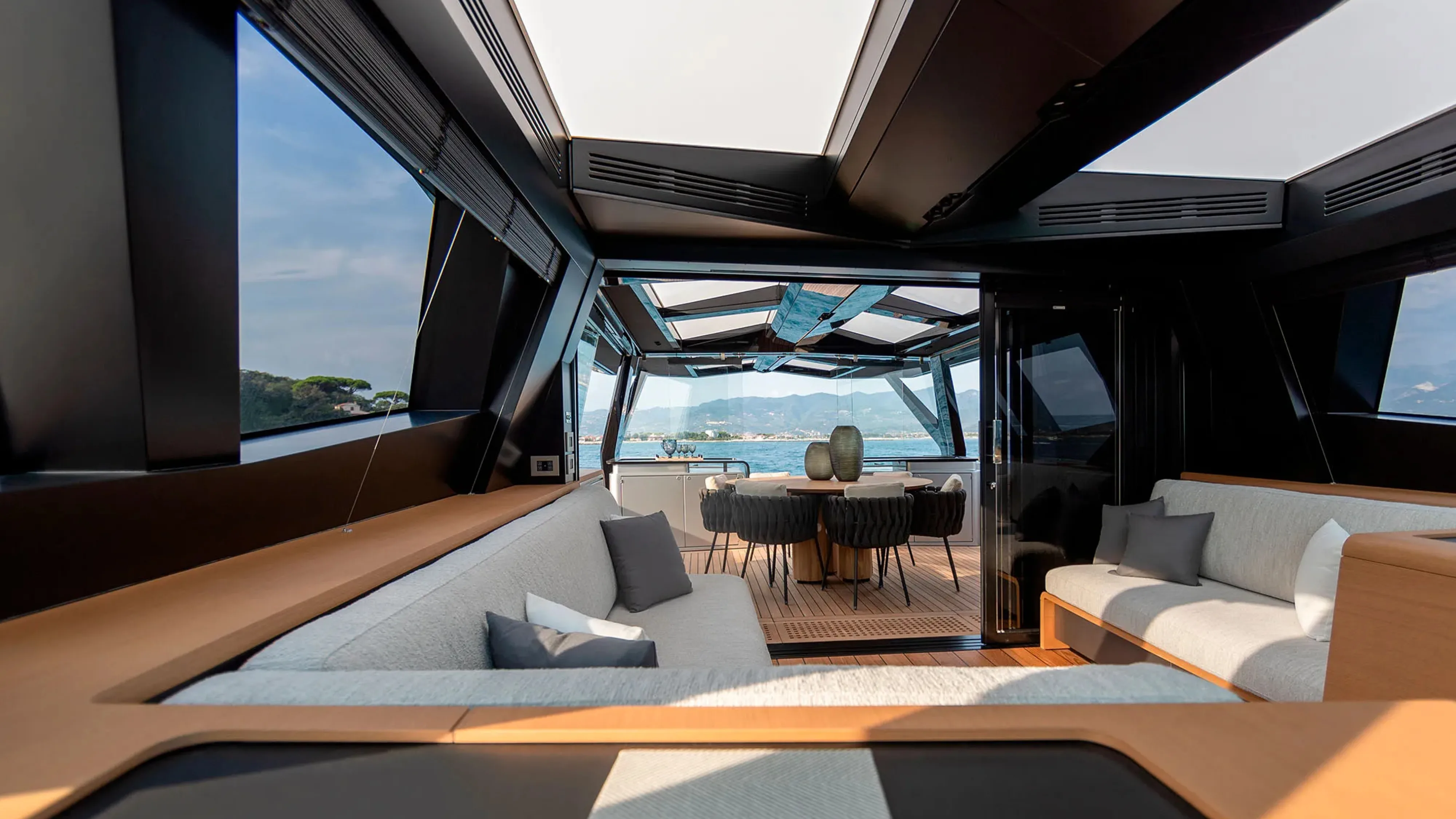 미래지향적인 실루엣과 거대한 유리 표면은 마치 영화 세트장에 떠 있는 듯한 느낌을 줍니다. 내부 살롱과 브릿지는 우아한 유리문으로 완전히 닫을 수 있고, 모든 것을 열어 요트 안으로 자유로운 바람을 불어넣을 수도 있습니다. 6인용 우아한 원형 테이블이 놓인 야외 식사 공간은 별빛 아래에서 파티를 열기에 딱 맞는 무대입니다.