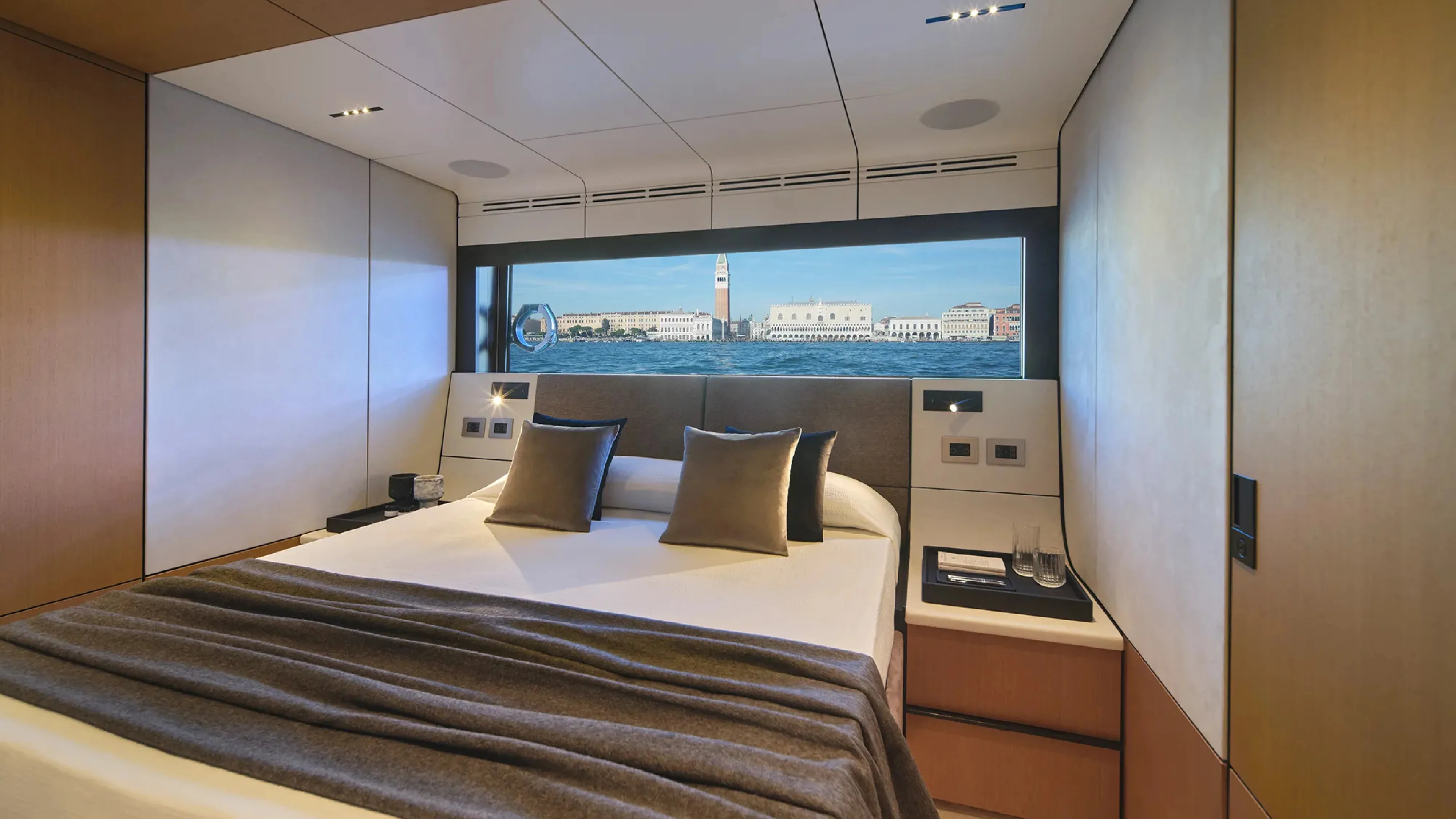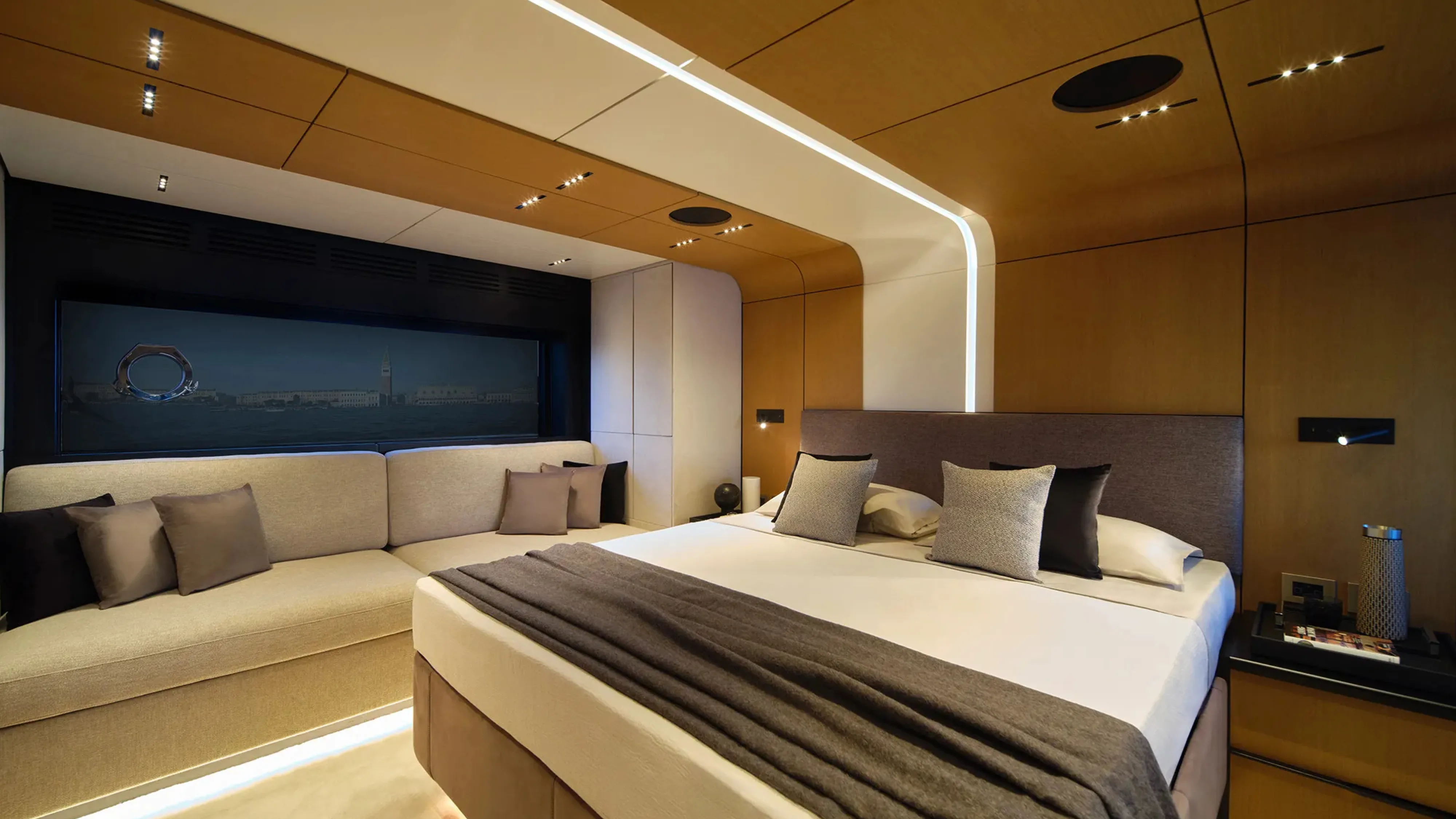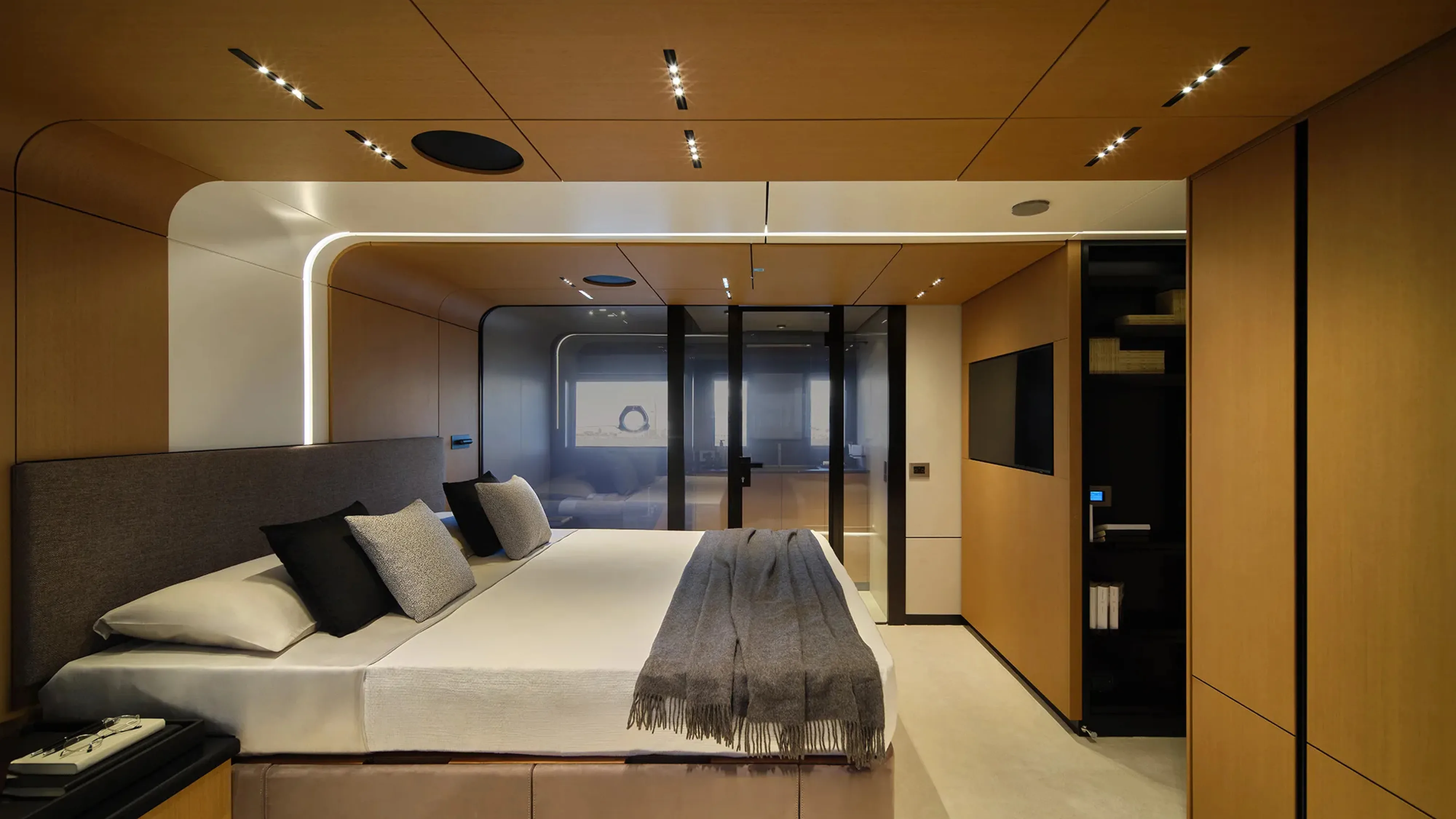 선실 전체 너비(5.6m)에 걸쳐 호화롭게 펼쳐진 마스터 객실에는 킹사이즈 침대, 전용 라운지, 버튼 하나만 누르면 유리벽이 희게 변하는 욕실이 마련되어 있습니다. 또한 wallywhy100은 더블 침대가 있는 객실 하나와 트윈 침대가 있는 객실 하나, 총 2개의 추가 게스트 캐빈을 제공합니다. 더욱 편안한 휴식을 위해 유압식 욕조 플랫폼과 다양한 라운저가 마련되어 있으며, 일몰을 감상하다 보면 멈춰 서고 싶어질 겁니다.