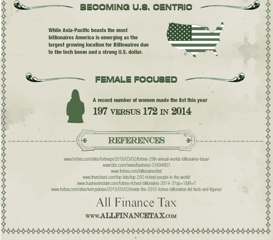 1191 milijarderjev je obogatelo samih, 230 milijarderjev je svoje bogastvo podedovalo in 405 milijarderjev je podedovalo del bogastva, ki pa ga sedaj še veča. Osem od desetih najbogatejših milijarderjev na svetu je Američanov in dve izmed teh sta ženski. Večina milijarderjev, kot so Bill Gates, Warren Buffett in Larry Ellison, so obogateli sami, medtem pa je le manjšina svoja bogastva podedovala.