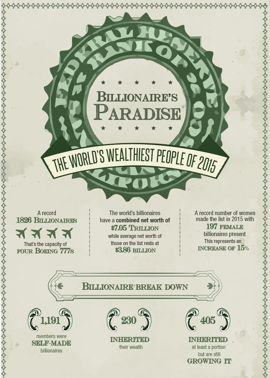 1191 milijarderjev je obogatelo samih, 230 milijarderjev je svoje bogastvo podedovalo in 405 milijarderjev je podedovalo del bogastva, ki pa ga sedaj še veča. Osem od desetih najbogatejših milijarderjev na svetu je Američanov in dve izmed teh sta ženski. Večina milijarderjev, kot so Bill Gates, Warren Buffett in Larry Ellison, so obogateli sami, medtem pa je le manjšina svoja bogastva podedovala.