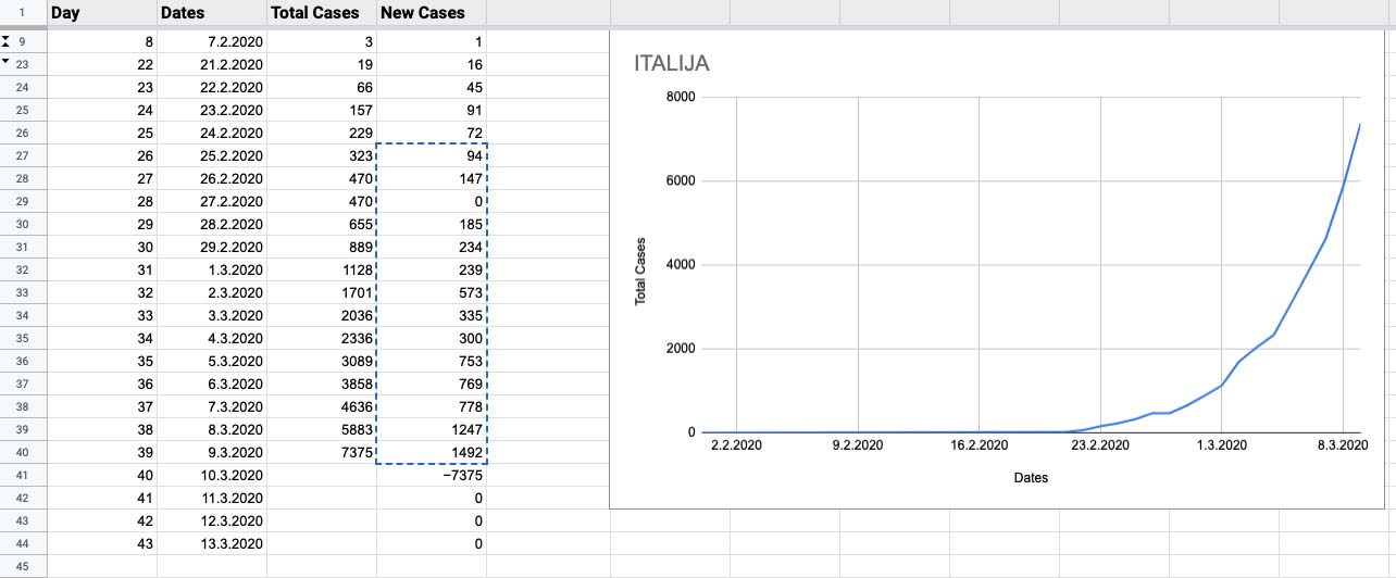 V uredništvu smo podatke o izbruhu vpisali v tabelo in ugotovili, da situacija v zadnjih dneh v Sloveniji vzbuja precejšnjo skrb. Namreč inkubacijsko dobo smo začeli s precej višjimi številkami kot Italijani, ki so se dober mesec uspešno borili proti izbruhu. Število 16 pa je v epidemiološkem smislu glede na število prebivalcev Slovenije že alarmantno. In praktično predstavlja absolutno število 480 okuženih v primerjavi s populacijo Italije.