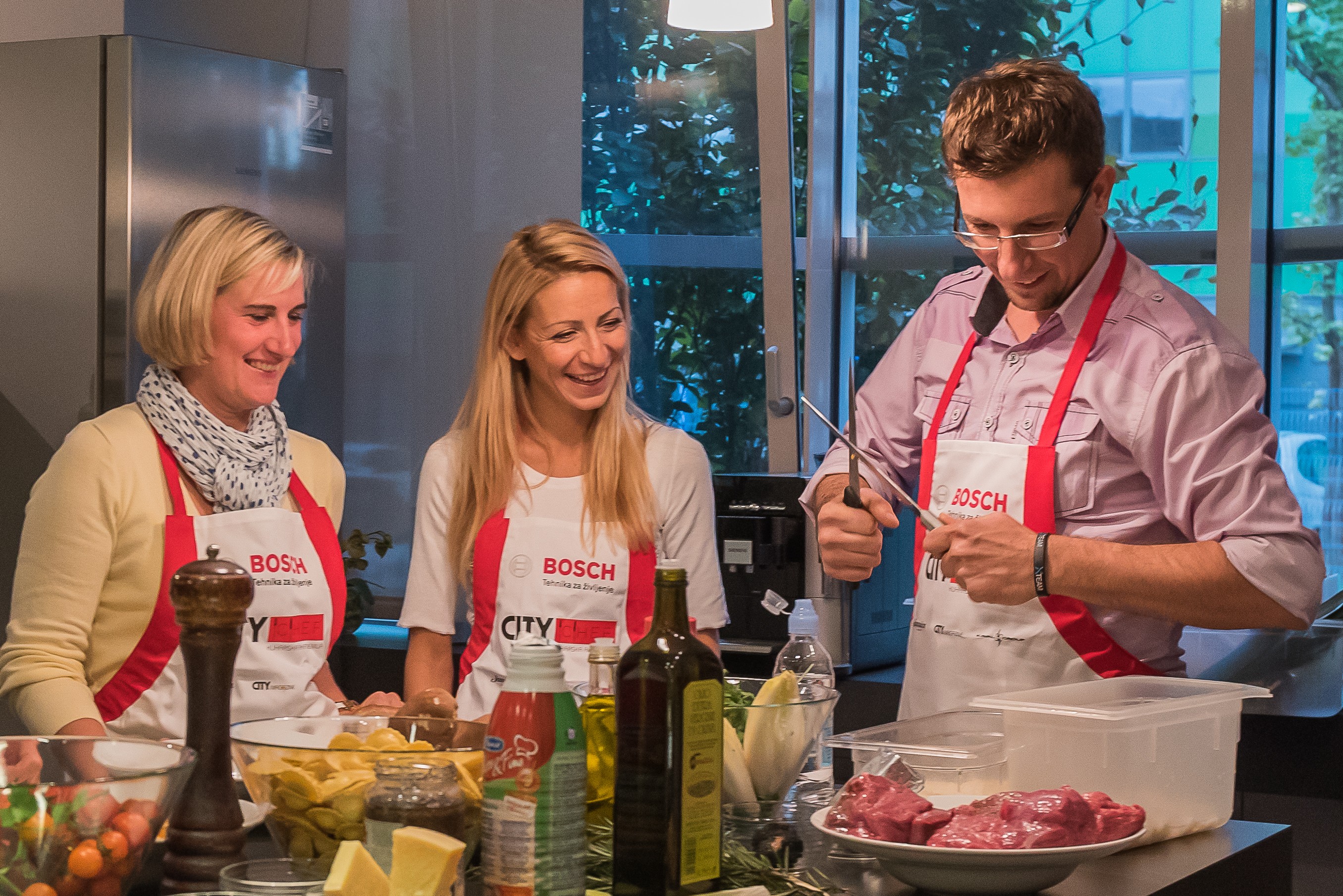 Na prvi jesenski dan, 23. septembra, smo Kuharsko akademijo – City Chef v prenovljenem salonu Bosch in Siemens z glavnim kuharjem Gostilnice in pizzerije Kaval, Draganom Marjanovićem, pričeli z božansko bučno juho z jurčki in s tartufi. Zakuhali smo tudi raviole z jurčki in gamberi, goveji file s svežimi jurčki pa smo nato pohrustali kot za stavo.