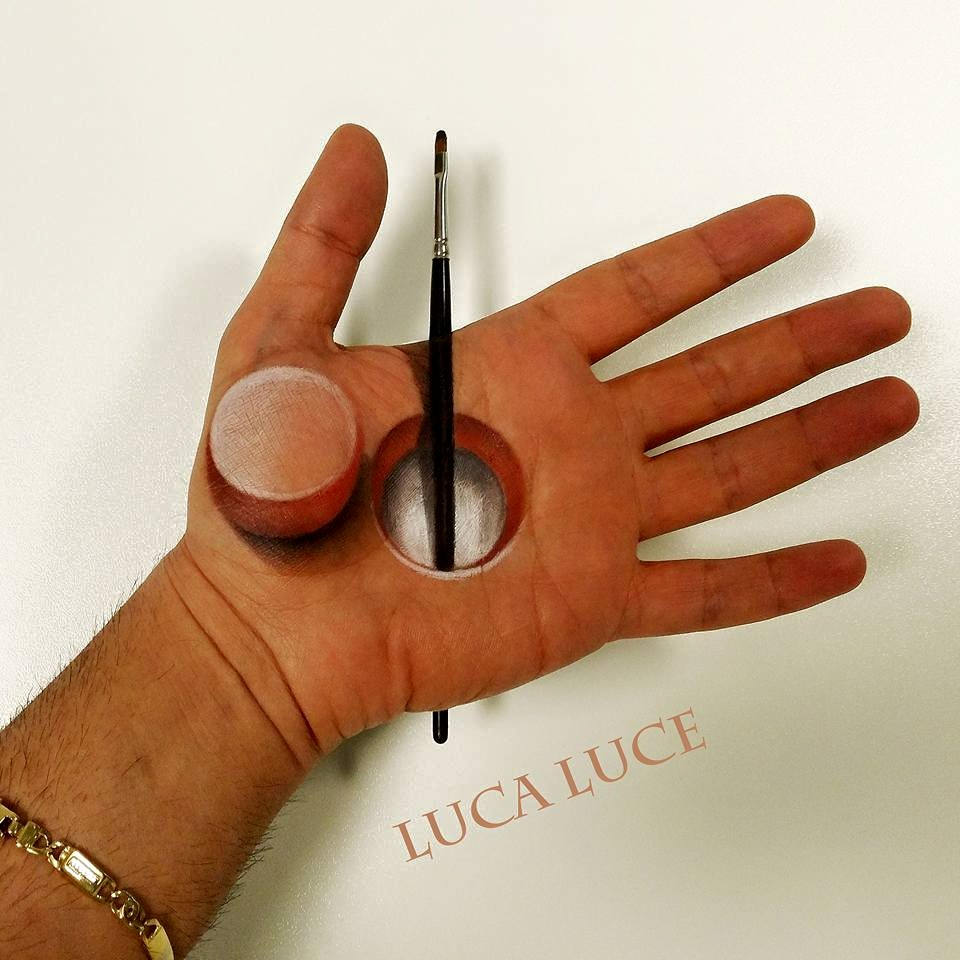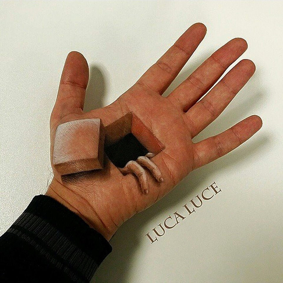 Kot otroci smo vsi čičkali po svojih rokah, a umetnik ličenja Luca Luce je risbe na rokah dvignil raven više. Ali kar dve. Na dlan namreč slika izjemne optične prevare. Gre za igro senc, perspektive in fotorealističen stil, ki ustvarjajo nadrealistične 3D umetnine kot so vtičnica, puzzle in miška ter begajo možgane.