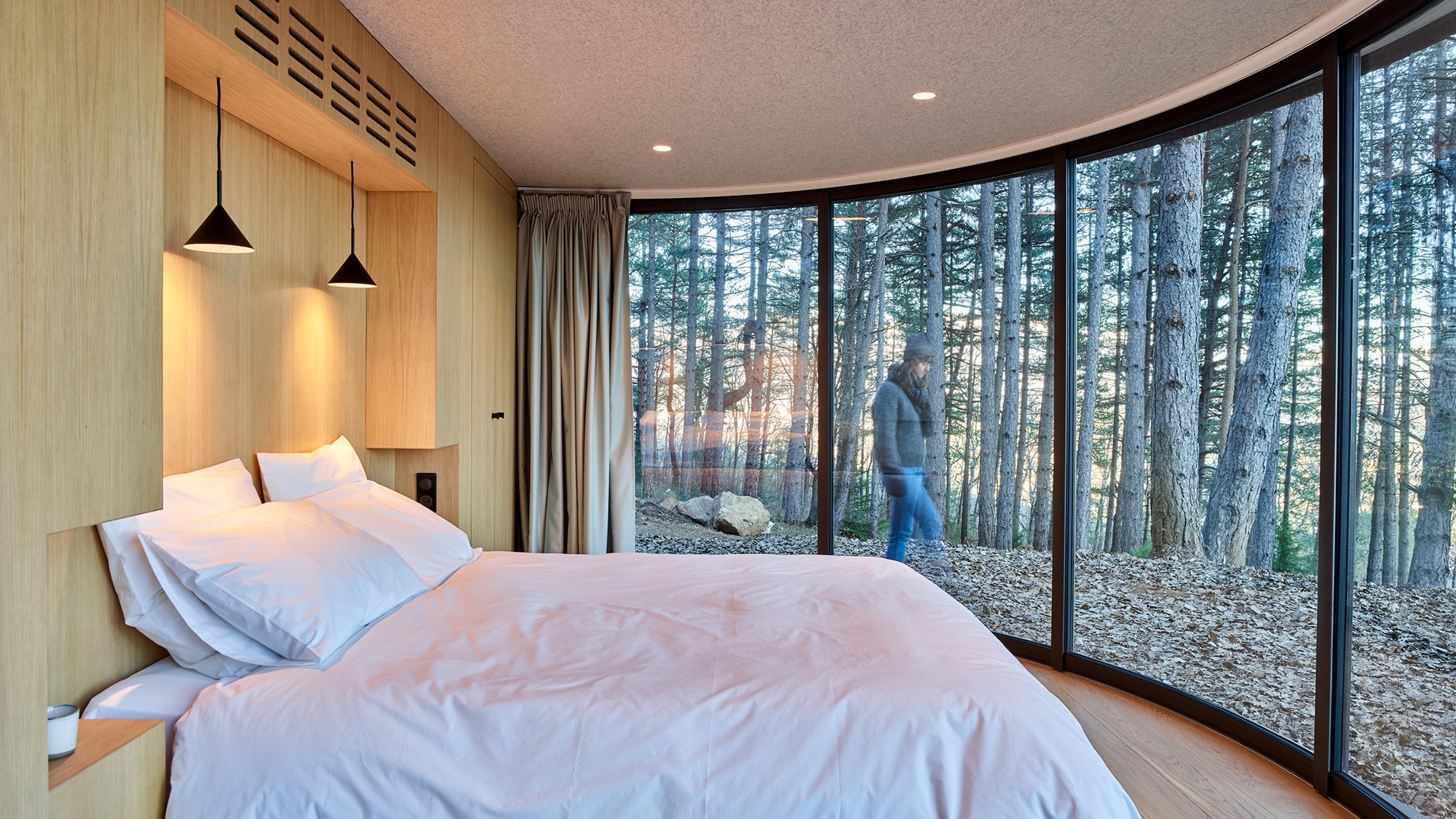 Lumipod se osredotoča na tisto, kar je bistvenega pomena. Zato so hiške precej minimalistične ter ponujajo 180-stopinjski pogled. V premeru merijo le 5,45 metra, oblikovane pa so kot hotelska soba višjega razreda. Poleg spalnice imajo tako še stranišče in tuš. Uokrivljeno okno z drsnim sistemom pa gostom omogoča, da ga lahko kadarkoli odprejo in se tako dobesedno združijo z naravo!