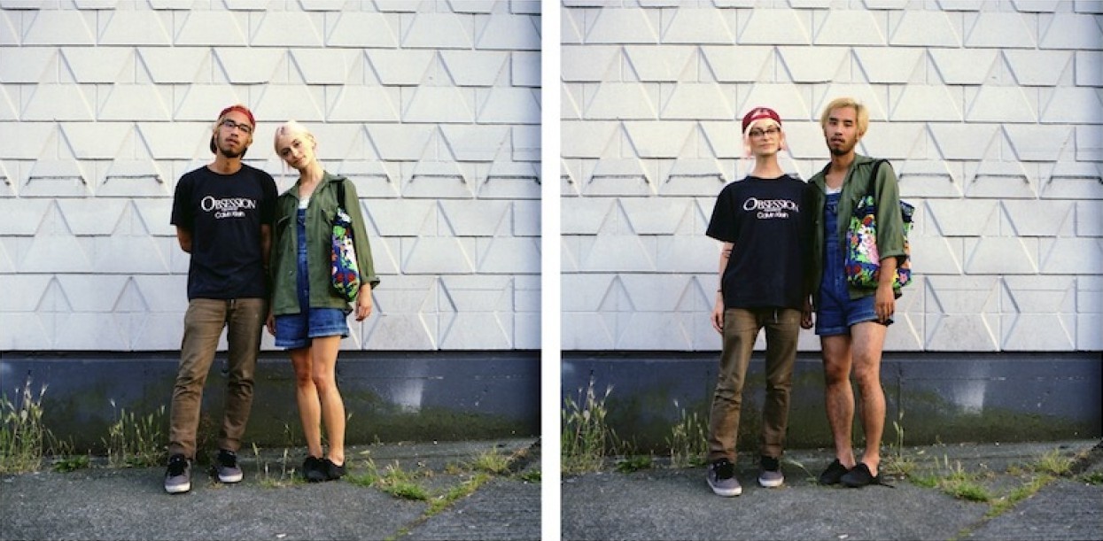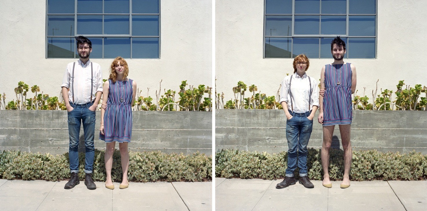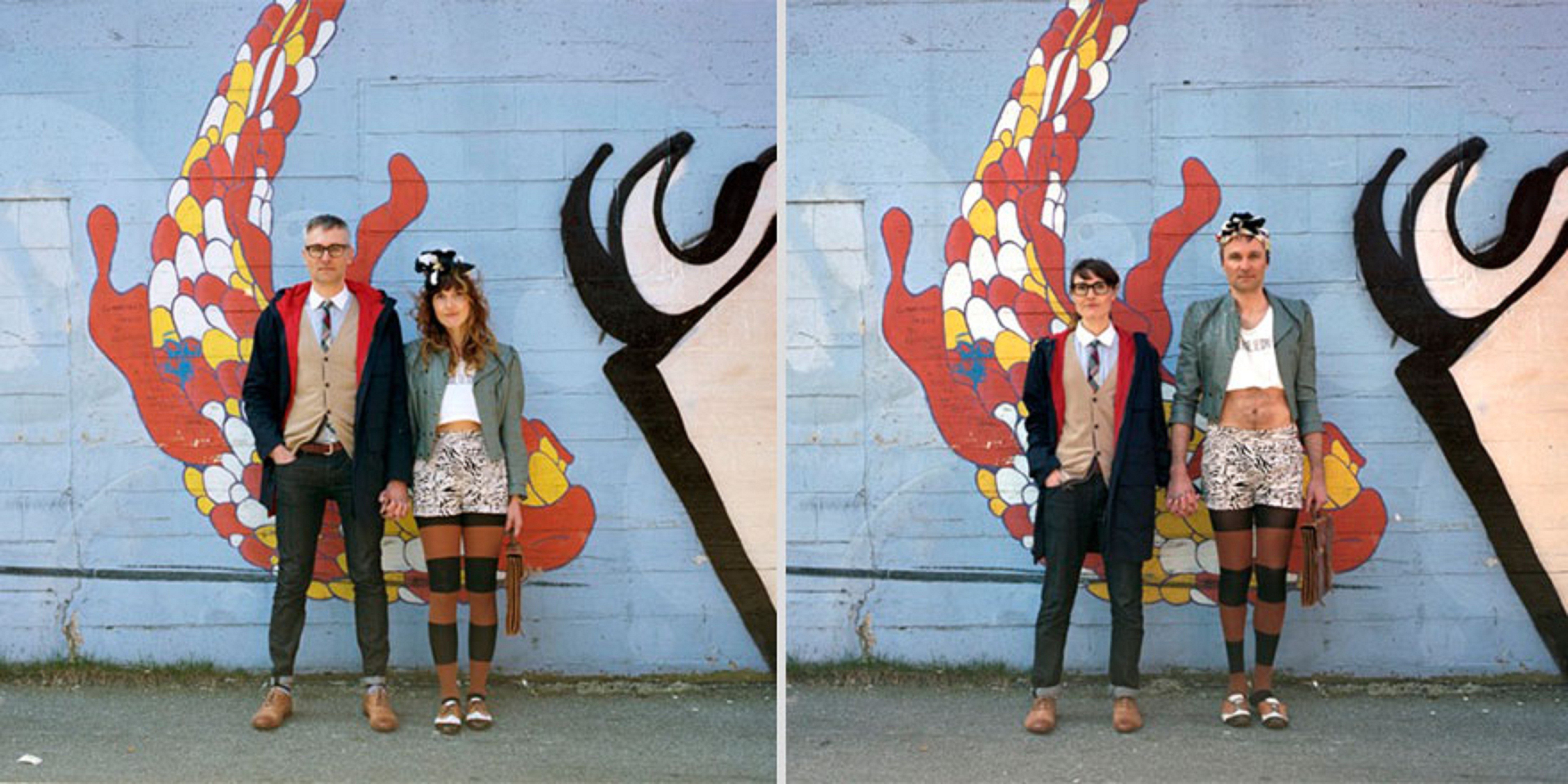 Kanadska umetnica Hana Pesut prinaša duhovito prezrcaljene portrete parov, ki drug z drugim v celoti zamenjajo svoja oblačila. Čeprav na videz preprosto dejanje, prinaša obilico smeha. S serijo “Switcheroo” je Hana sicer pričela že pred leti, a vizualni eksperiment pogosto ekstremnih fizičnih in stilističnih razlik med obema spoloma še naprej na razvedrilen način razbija stereotipe. Kako tudi ne bi, saj je razkazovanje poraščenega popka in prevelikih stopal, stlačenih v lične petke na eni ter prevelika oblačila pobalinskega izgleda na drugi strani ne le čudaško, temveč tudi nadvse komično.