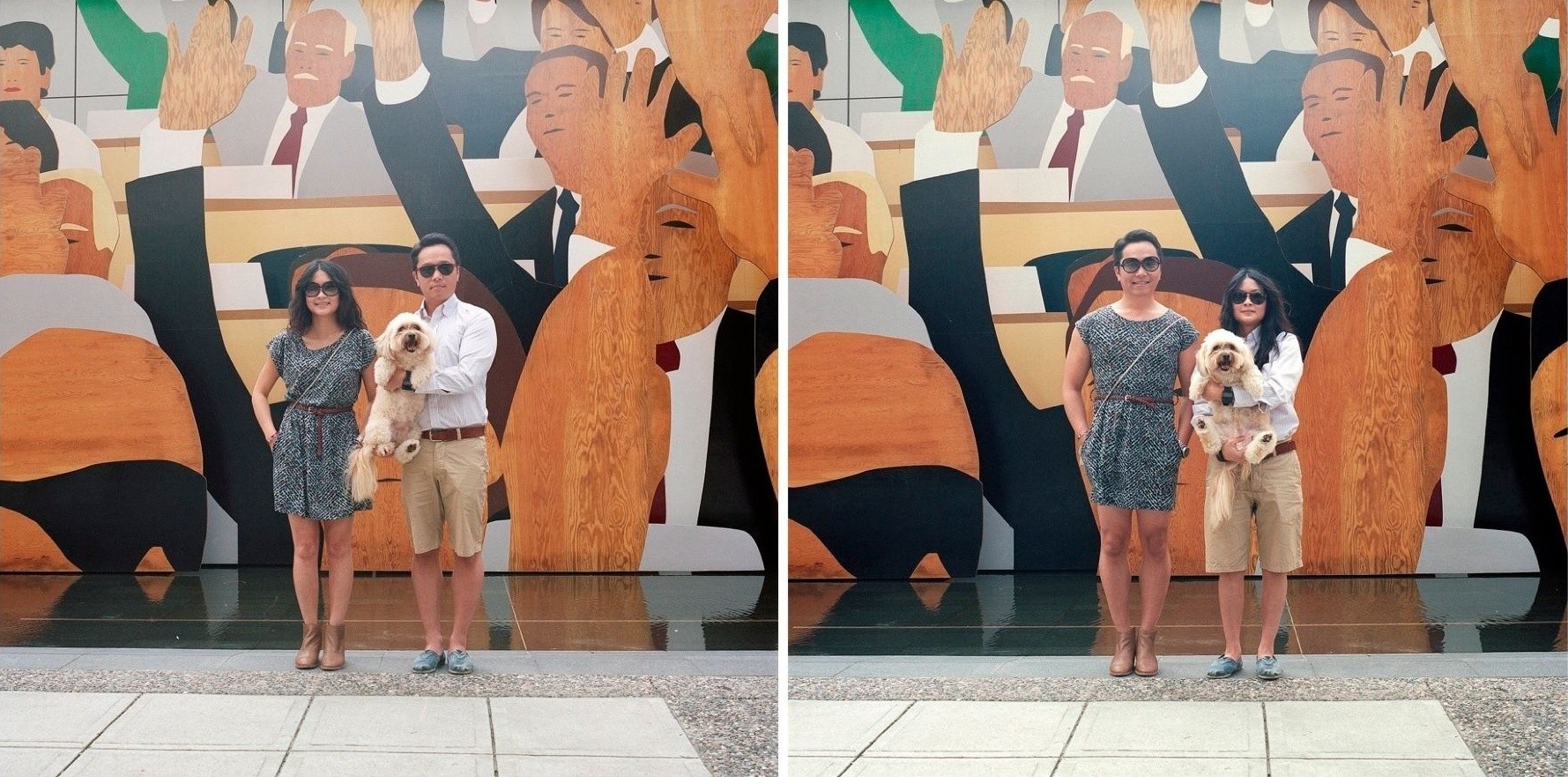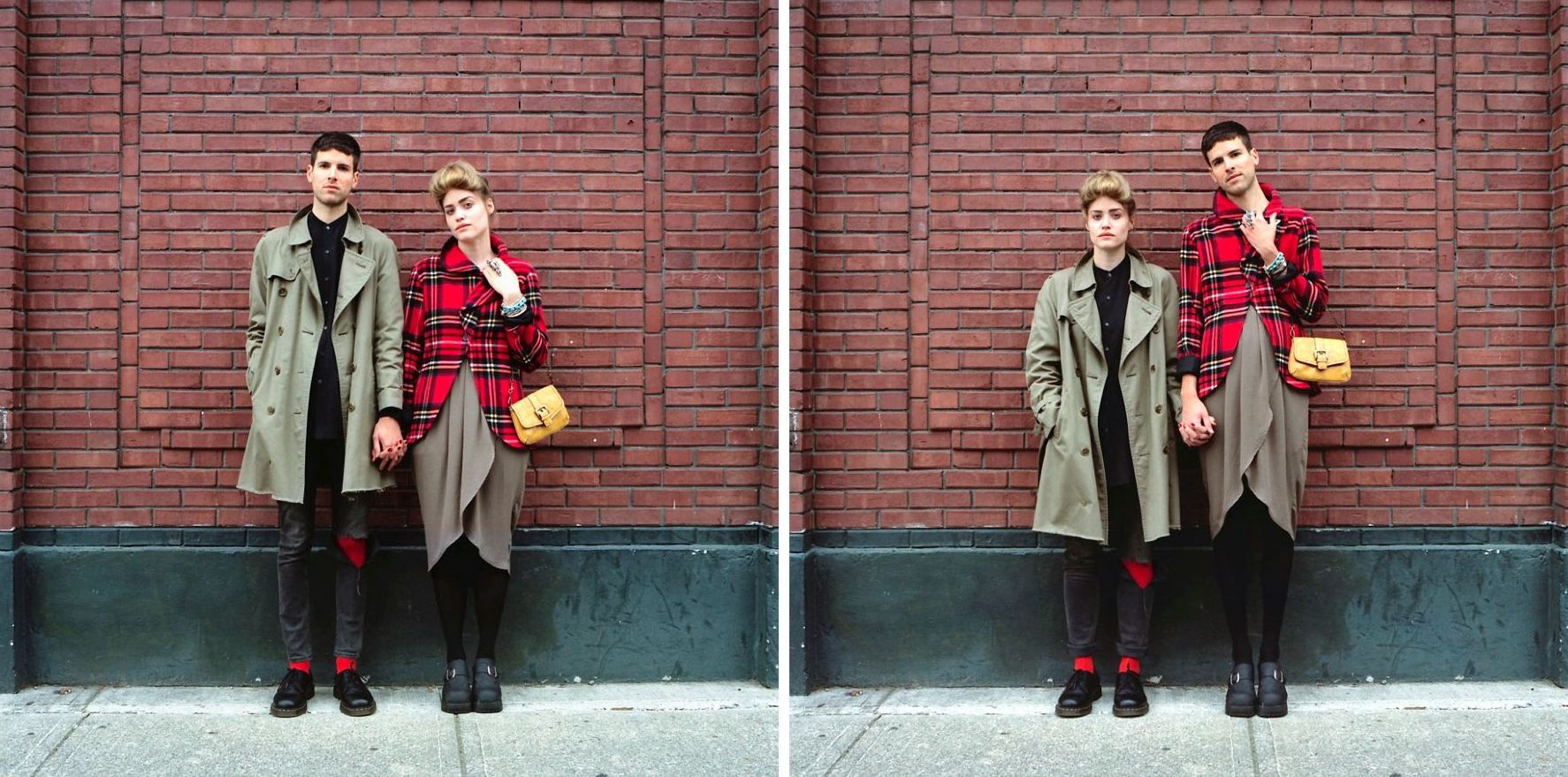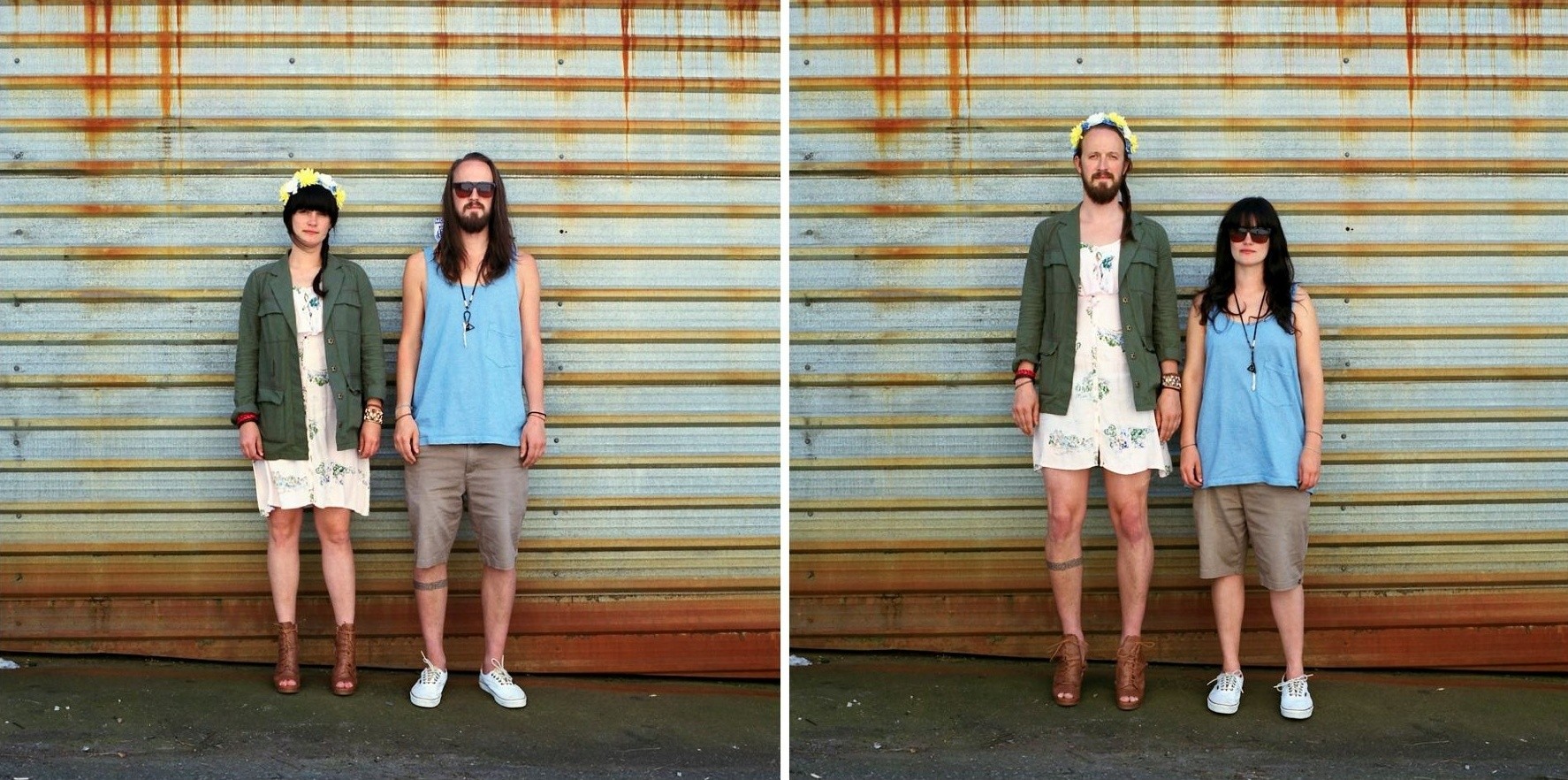 Kanadska umetnica Hana Pesut prinaša duhovito prezrcaljene portrete parov, ki drug z drugim v celoti zamenjajo svoja oblačila. Čeprav na videz preprosto dejanje, prinaša obilico smeha. S serijo “Switcheroo” je Hana sicer pričela že pred leti, a vizualni eksperiment pogosto ekstremnih fizičnih in stilističnih razlik med obema spoloma še naprej na razvedrilen način razbija stereotipe. Kako tudi ne bi, saj je razkazovanje poraščenega popka in prevelikih stopal, stlačenih v lične petke na eni ter prevelika oblačila pobalinskega izgleda na drugi strani ne le čudaško, temveč tudi nadvse komično.