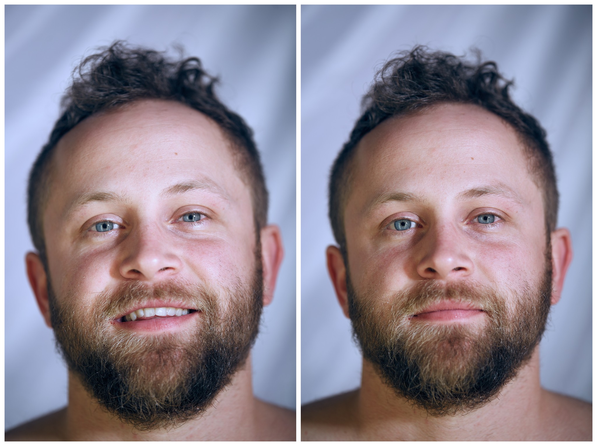 Prvi portret je posnel, ko je bil kandidat oblečen, drugega pa, ko je oblačila odvrgel. Nato je fotografiji postavil drugo ob drugo, da bi odkril, kako se je izraz na njihovem obrazu spremenil. Oglejte si serijo portretov in se na lastne oči prepričajte v moč neverbalne komunikacije in koliko nezavedno izdajamo s svojo govorico telesa.