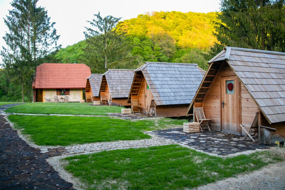 Med en idyllisk beliggenhet, ikke langt fra den populære Bledsjøen, er det åtte komfortable glampinghus. Du finner dem i ly av en granskog, ved siden av bredden til Sava-elven, som holder deg kjølig selv på sommerdager. De er et resultat av arbeidet til slovenske håndverkere og slovensk tre, og på grunn av beliggenheten gir de gjestene fullstendig privatliv, ikke langt fra turistperlen. De er også utstyrt med eget utendørs badekar og badstue, og du kan skjemme deg bort med en slovensk kurv full av slovenske godsaker.