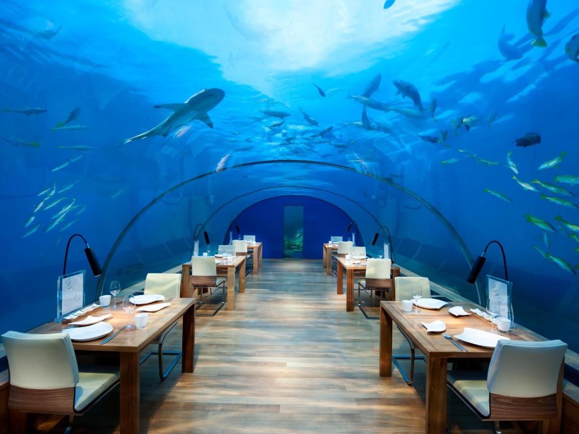Et vakkert hotell med mange brygger og stier arrangert over havnivået i Det indiske hav skjuler en ekte skatt noen meter nedenfor. Ta trappene ned til restauranten Ithaa, som ligger fem meter under havoverflaten. Den første innglassede undervannsrestauranten med store glasstunneler og deilig mat er en av de der hvaler og andre sjødyr holder deg med selskap under middagen.