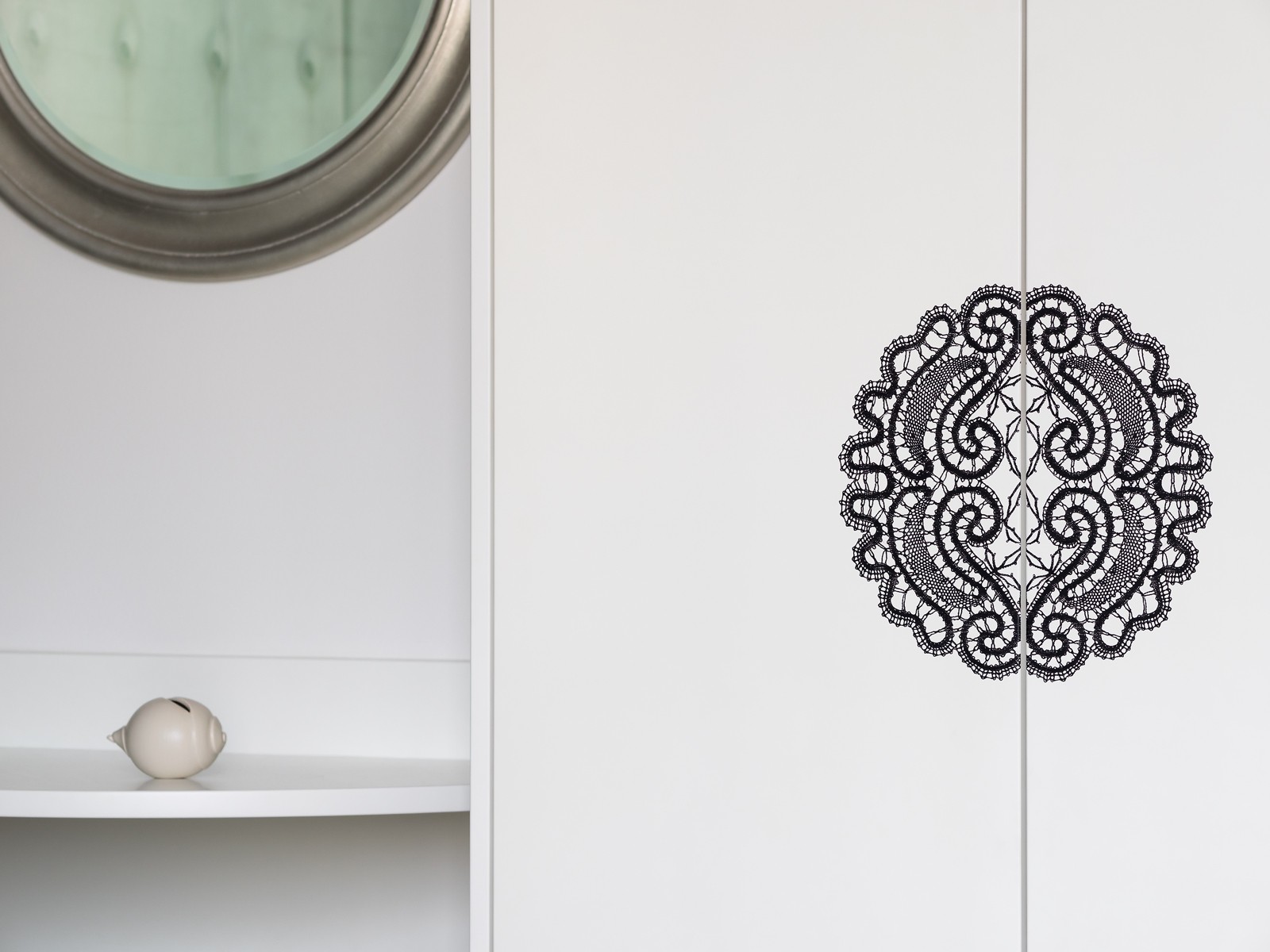 Obiskovalce pri vhodu v stanovanje najprej pozdravijo na strop natisnjene pogoste slovenske besede, izpisane v Plečnikovi pisavi Makalonca. Plečnikov pečat zaznamuje tudi spalnico, ki jo krasi foto tapeta z motivom Križank avtorja Staneta Jeršiča. Pohištvo v spalnici je okrašeno z motivi tradicionalne idrijske čipke, ki jih je oblikovala Vanda Lapajne.