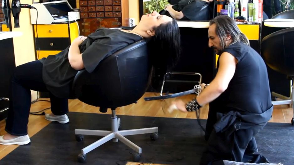 Den spanske frisøren Alberto Olmendo er en uvanlig frisør som bruker en katana (sabel), samurai-sverd og ild i stedet for de vanlige verktøyene for å klippe hår, som saks og barberhøvel! Ville du betro håret ditt til ham?