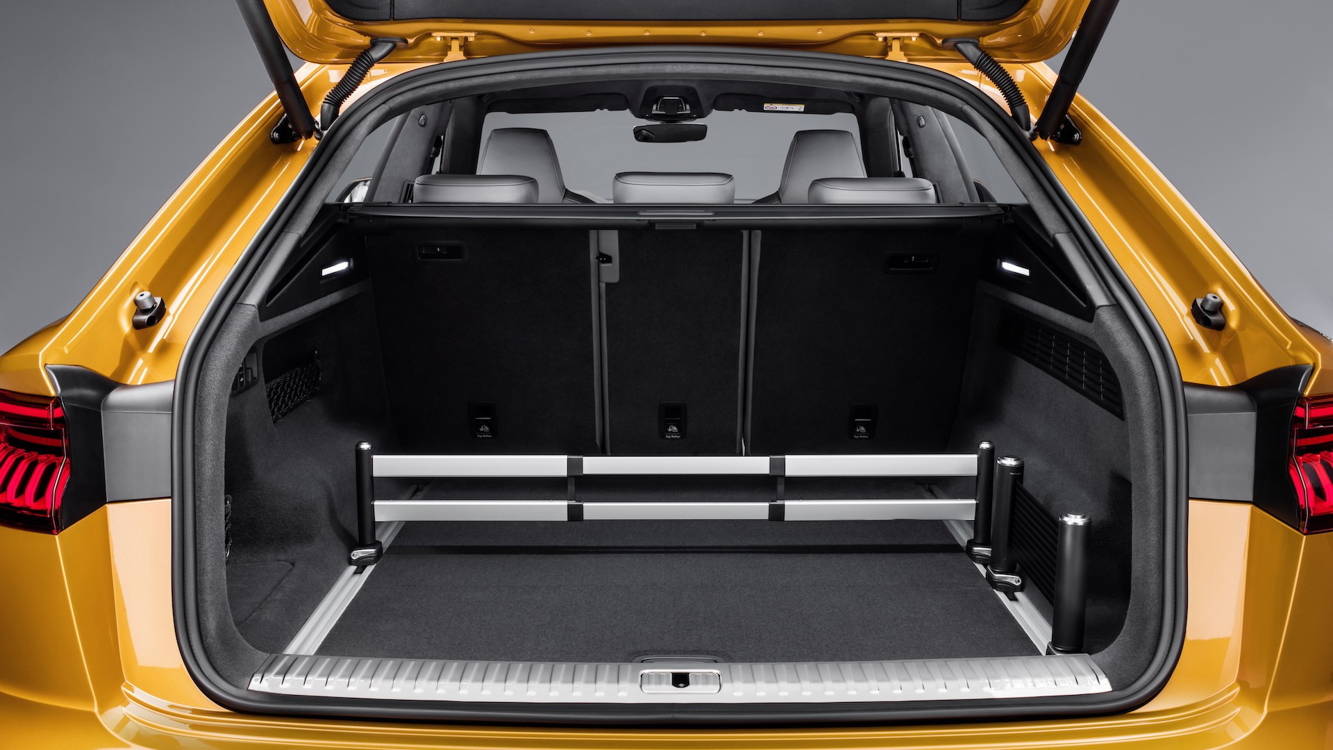 Audi Q8 ima prtljažnik s 605 litri prostornine, če pa poklopimo zadnje sedeže, se ta poveča na 1.755 litrov. In če ste se mogoče spraševali, odgovor je da, tudi v Audija Q8 lahko pospravimo dva kompleta palic za golf. Vizualno bomo lahko novega Audija Q8 z lahkoto ločili od ostalih Audijev z oznako Q. Na prednjem koncu prevladuje ogromna maska, s šestimi navpičnimi kromiranimi rešetkami, ki jih lepo dopolnjujejo markantni matrise LED-frontlykter. Stranski profil poudarja velik C-stebriček in spuščajoča se streha. Zadek zaznamujejo LED-luči, ki so med seboj povezane s tanko LED-svetlobno linijo in okusno integriran spojler.