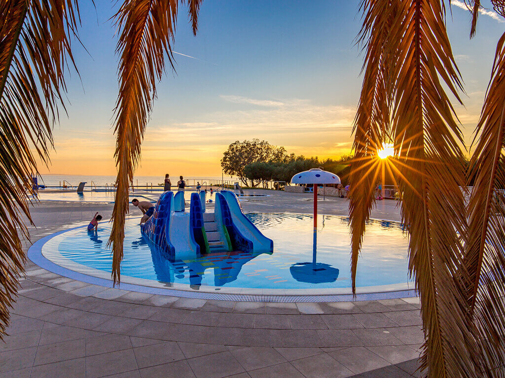 Solaris Beach Resort ligger i nærheten av Šibenik, som er kjent for sine forskjellige strender og attraktive badeland. Leiren ligger i skyggen av furutrær, overgrodd med velduftende middelhavsvegetasjon. Du kan velge mellom ulike tomter ved sjøen og blant furutrær, som alle er utstyrt med strøm, vann, satellittsignal og trådløst internett. Familier vil glede seg over familiebadene, og eiere av lodne kjæledyr vil glede seg over dusjene for firbeinte venner.