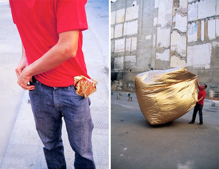 Martin Azua laget av dette materialet selvoppblåsende bobil Basic House, som du kan putte i lommen, og den utvides til den størrelsen den gir komfortabelt og trygt ly. Den isotermiske folien har en dobbel funksjon. Den varmer og avkjøler. Sølvsiden beskytter mot kulde, og gullet mot varmen. Folie i dette tilfellet reflekterer de brennende solstrålene og absorberer kroppsvarmen, mens sølvdelen på den annen side også beskytter fra fuktighet.