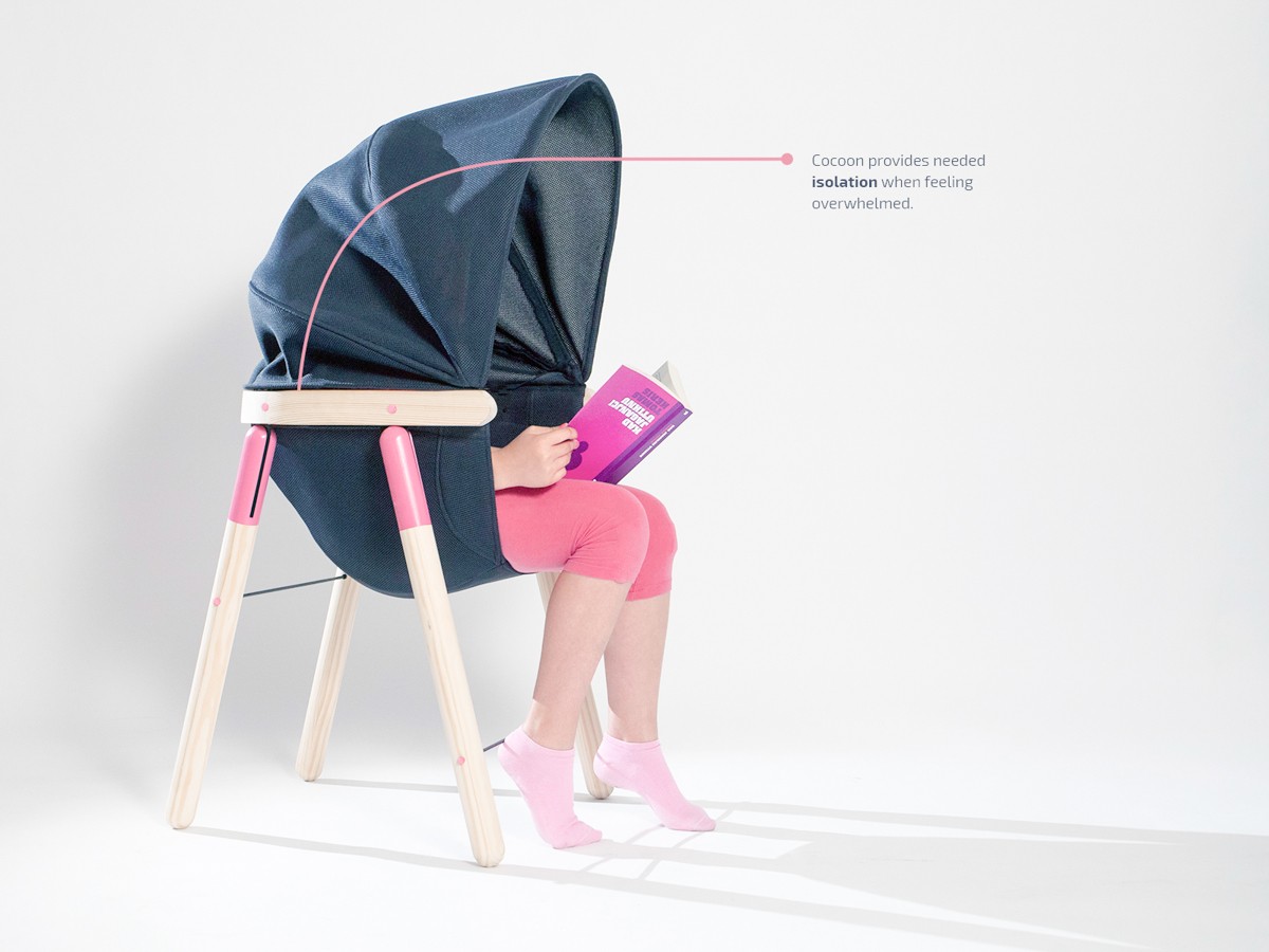 Beroligende stol for barn "beroligende stol" er en del av prosjektet Dorje Benussi, der designeren utvikler sansemotorisk pedagogisk utstyr. Dorja er overbevist om at denne typen møbler kan ha en positiv innvirkning på barns utvikling, siden de stimulerer sansene og forbedrer kvaliteten på hukommelsen og læringen. Setet på den beroligende stolen 'Soothing Chair', som ikke er fast, svaier forsiktig og hjelper til med bedre konsentrasjon, og ved overbelastning kan stolryggen bli en trygg kokong som fungerer som et skjold som de små under. kan finne sin ro igjen.