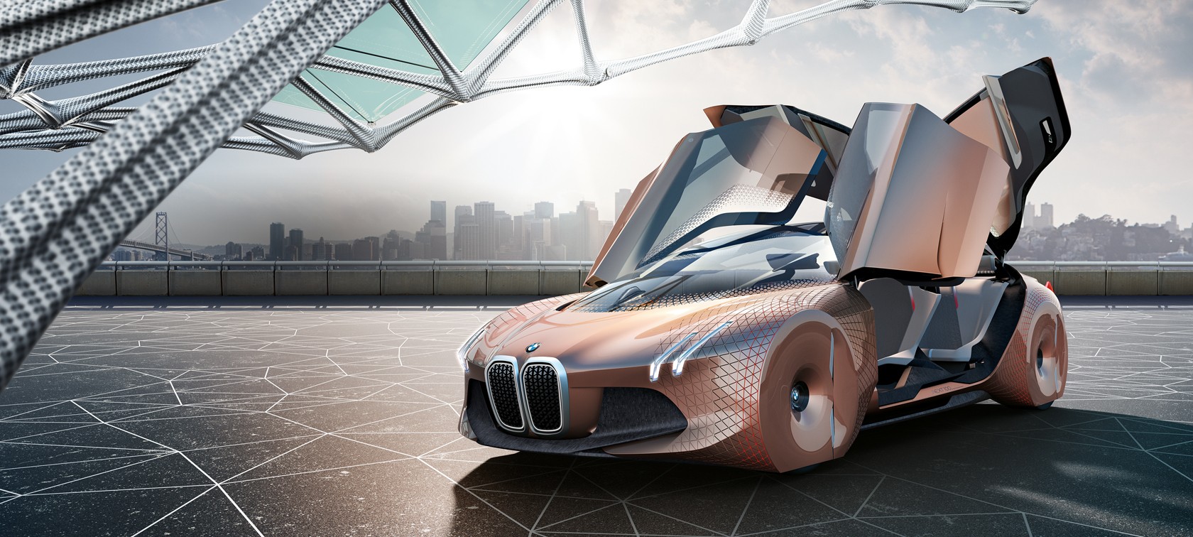 BMW Vision Next 100 Concept Det er studie av autonome kjøretøy, som fullstendig adlyder sjåførens behov. Hos BMW oppnådde de at sjåføren og bilen føles som ett med systemet.Levende geometri” (live geometri) som kommuniserer med sjåføren i Boost- og Ease-modus. I den første overlater den kontrollen av styringen til sjåføren og ga med et aktivt sikkerhetssystem som en skytsengel beskytter mot farlige situasjoner (med en skjerm ideelle kjørelinjer, gi råd om optimal hastighet, ratthelling, projeksjon av usynlige hindringer ...), mens i Ease-modus overlater føreren fullstendig kontroll og valg til kjøretøyet, da det er beregnet på autonom kjøring (rattet er lagret i dashbordet, hodestøttene justeres, fører- og passasjersetene svinger mot hverandre...). I samsvar med begge regimene er interiøret sterkt endret, som kan skryte av en bil 800 bevegelige deler.