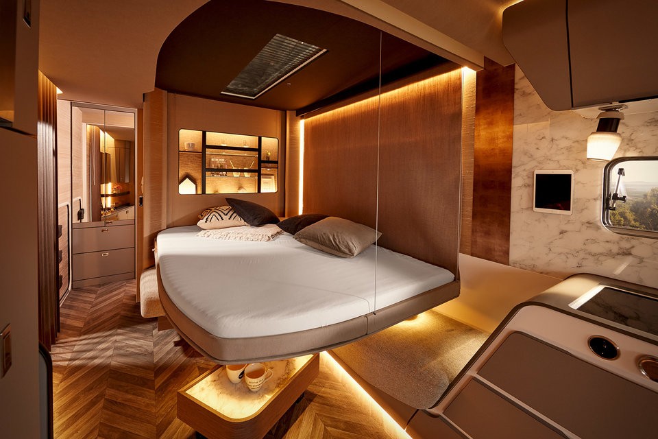 Til tross for all luksusen forblir de ytre dimensjonene til tilhengeren i helt normale proporsjoner, ettersom boarealet er inne smart utplassert. Han skal legge seg slipp det fra under taket og tilbyr dermed sove mens du henger "i luften". Dessverre handler det bare om konseptuelt en campingvogn, som likevel viser at en campingvogn også kan være like luksuriøs som luksusrom på prestisjehoteller.