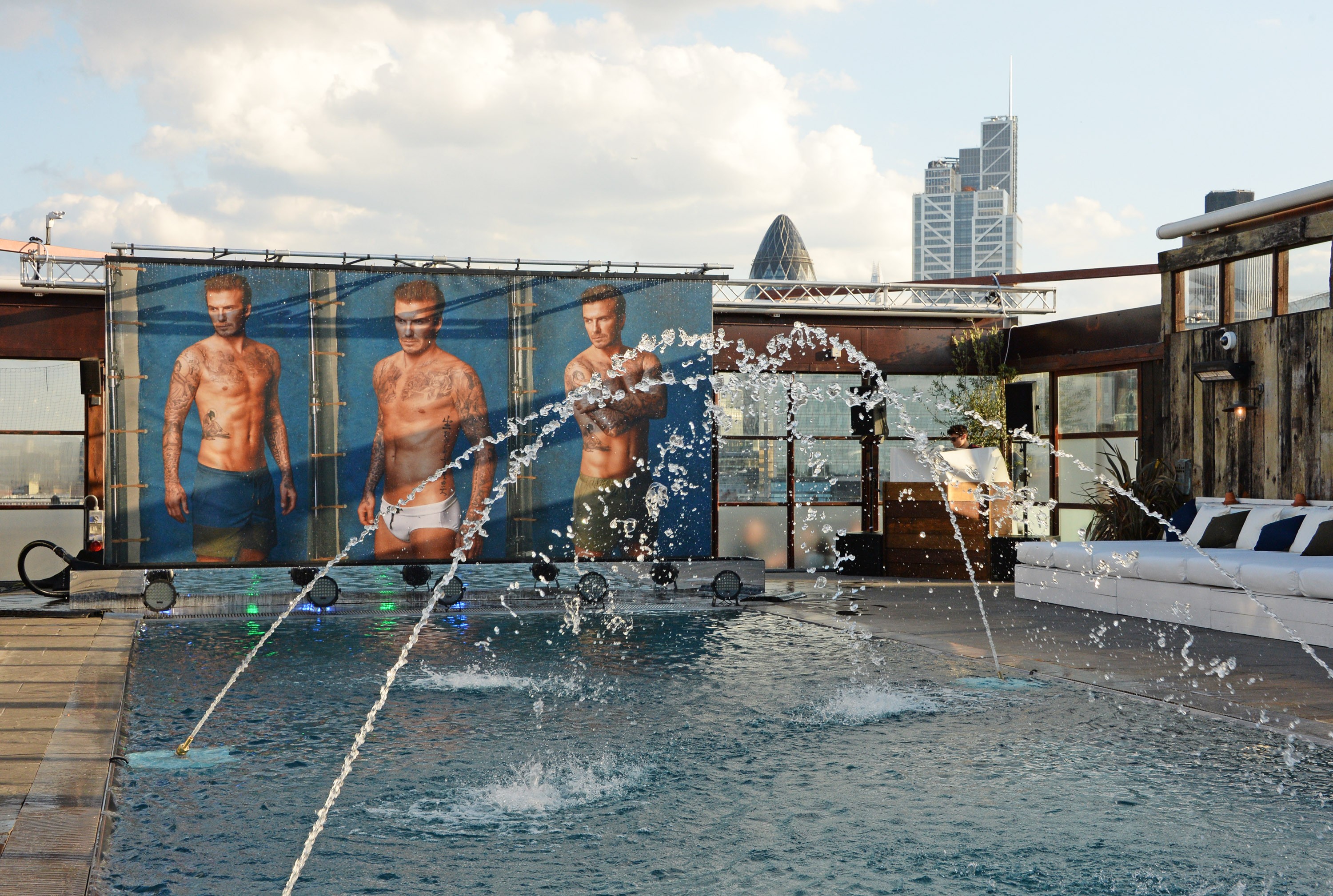 David Beckham var vertskap for en eksklusiv bassengfest på taket for å lansere den nye David Beckham-badetøykolleksjonen for H&M. Gjester inkludert Ellie Goulding, One Directions Liam Payne og Niall Horan og Aaron Paul festet på luksusfesten øst i London.