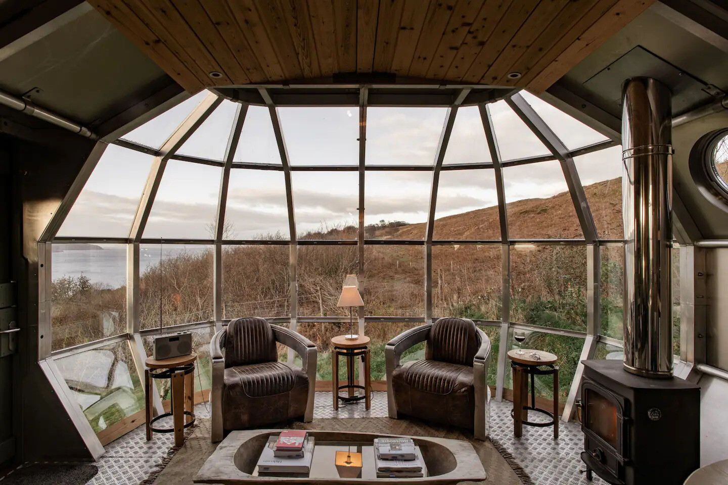 Hvis du er i Skottland, kan du bo der smarte romskip. Den unike strukturen – et isolert aluminiumsgulv – ble designet av den britiske arkitekten Roderick James. Flankert av sekskantede kupler i glass, er det en elegant salong med en peisovn på den ene siden og et kontorpult på den andre, begge med vidstrakt utsikt over Sound of Mull. Innimellom er en dobbeltseng smart plassert bak en gardin og har utsikt over de åpne vinduene, mens et lite kjøkken med sammenleggbart spisebord utnytter plassen smart. Bestill oppholdet for så lite som 204 $ per natt med et opphold på minimum tre netter.