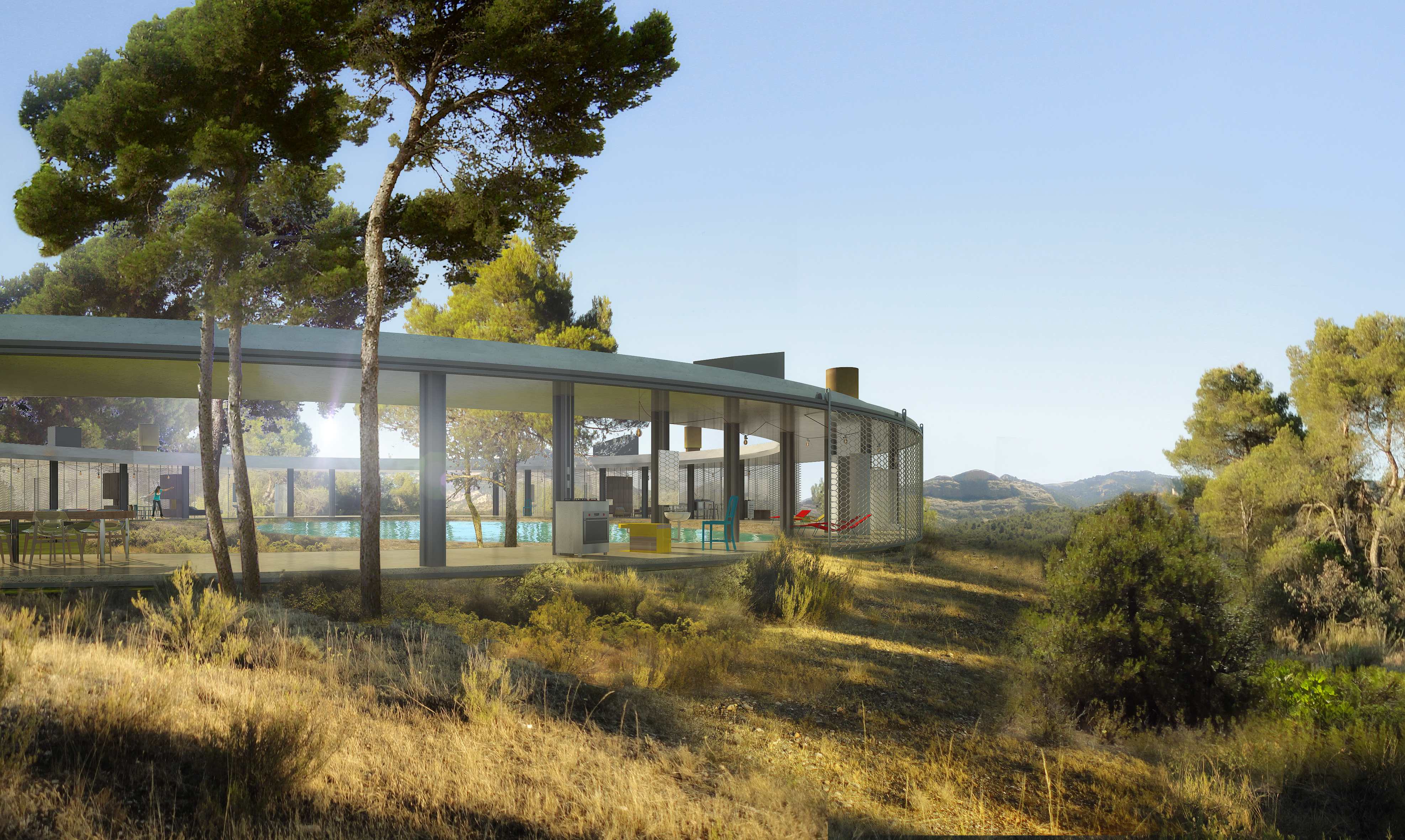 På den imponerende spanske landsbygda Matarrana Det er Belgisk arkitektkontor designet et hus som går i ett med omgivelsene og understreker dens naturlige skjønnhet. På grunn av det ekstremt vakre landskapet med middelalderlandsbyer, krystallelver og oliventrær minner det mye om det italienske Toscana. På toppen av platået som har utsikt over Middelhavet, er et sirkulært tak med en diameter på 40 meter. Taket bæres av fire ovale vegger. Utsiden av det runde huset kan dekkes med en gardin for å hindre nysgjerrige blikk. Interiøret er også delt inn i fire deler: stue, privat område, gjesteområde og svømmebasseng. Det er en stor hage i den indre sirkulære atriumgårdsplassen.