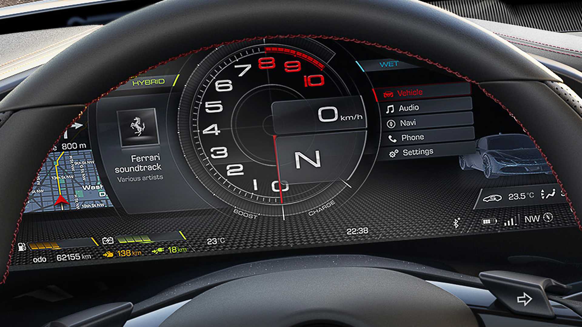 Overføringen skjer via en dobbeltclutch 8-trinns automatgir, og etter Ferrari GTC4Lusso er vi nok en gang vitne til firehjulsdriftInteriøret er orientert rundt 16-tommers høyoppløselig skjerm og et sportsratt med en rekke knapper – alt dette minner oss om Cockpiter for Formel 1-racerbilerFerrari SF90 Stradale er på 1570 kilogram til 13 kilo lettere fra forgjengeren er chassiset for 20 % hardere, mens torsjonsstivhet økt med 40 %.