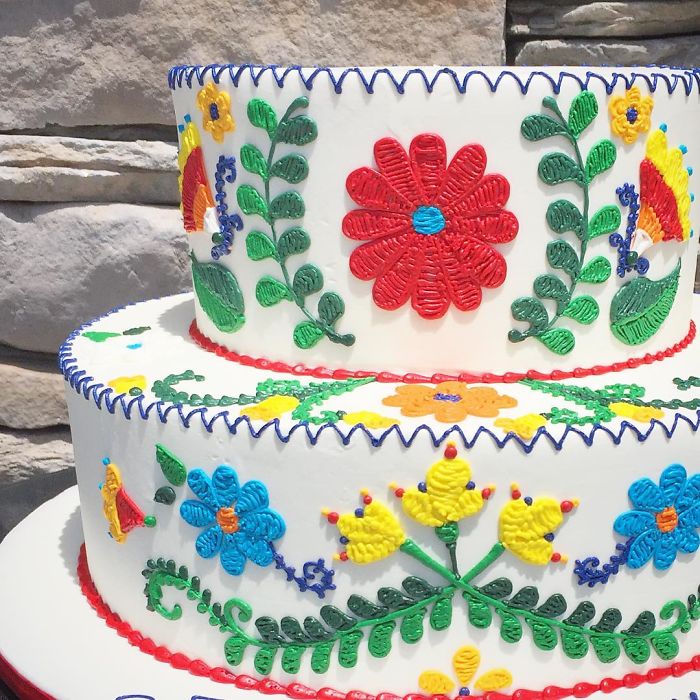 Leslie Vigil er en mesterkonditor som lager lagdelte mesterverk fra desserter, inkludert skogsdyr, kaktus og til og med krystallformasjoner. Hennes siste kakesamling heter Tapet, og for henne lærte hun kunsten å brodere og skapte ved hjelp av broderier "sydde" blomster som pynter kaker. Så det er en billedvevdekor som minner om broderte meksikanske kjoler, selv om Leslie nevner russiske broderier og vårblomster som inspirasjon.