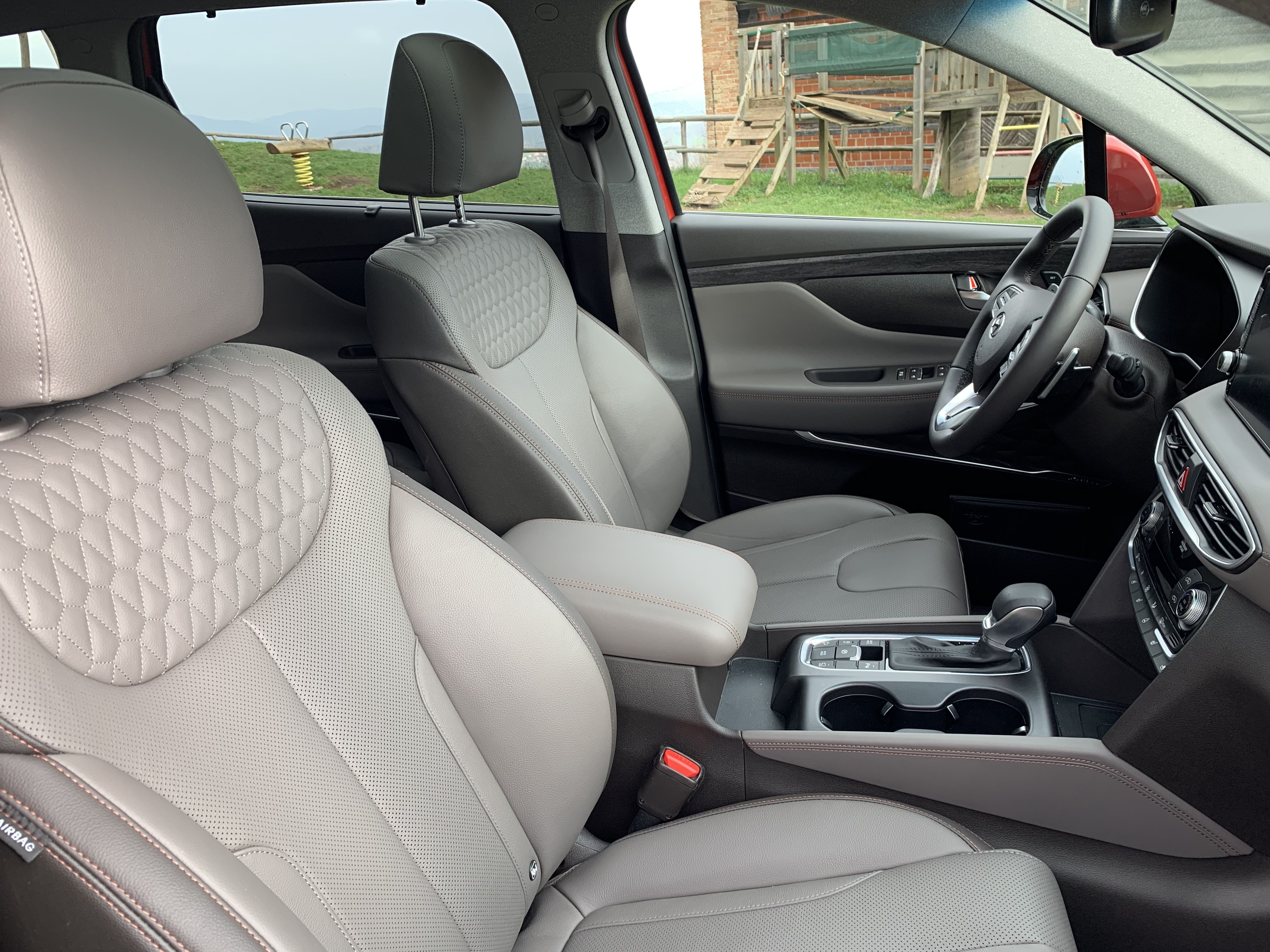 Interiøret i passasjerkabinen kan forestilles i fire forskjellige farger, og det er en merkbar forbedring i materialene som brukes og høyere kvalitet på interiørarbeidet. Midt på dashbordet er den såkalte flytende skjerm berøringsskjerm, tilgjengelig i størrelse 5- , 7-, eller 8-tommers, avhengig av valgt utstyrsnivå. Bagasjerommet er økt med 40 liter, og vi kan nå sette den inn for 625 liter bagasje. Bakrutene på siden har en 41% et større overflateareal, noe som betyr at åpenhet Hyundai Santa Fe er tilgjengelig med med fem eller innen syv seter.