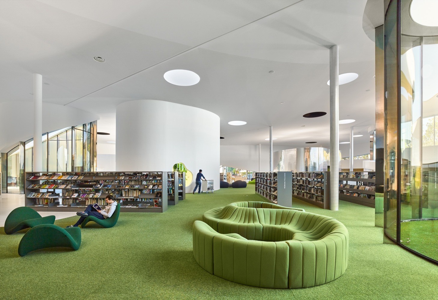 Det futuristiske biblioteket i Frankrike av Dominique Coulon & Associés er det siste oppkjøpet av byen Thionville. Biblioteket er futuristisk ikke bare i form, men også i innhold: i tillegg til bøker tilbyr det brukerne et rikt utvalg av produkter i medieformater. Når det gjelder interiøret, spår prosjektet en veldig komfortabel fremtid: i tillegg til den klassiske lesesalen, tilbyr biblioteket utallige skjulte hjørner foret med myke puter.