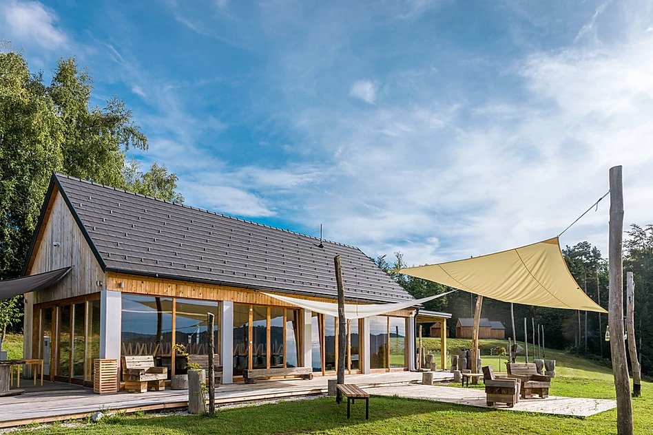 Bare et skritt unna Plahutniks leilighet ligger de i utkanten av skogen idylliske trehus, også egnet for en flerdagers ferie. Trehusene er enkle, med en liten terrasse og en stor glassvegg der utsikten sprer seg over de omkringliggende åsene. Den store dobbeltsengen tilbyr komforten til topphoteller, og trebadekaret skaper en romantisk atmosfære. Barn vil også nyte naturen, siden det er et sted for volleyball, en fotballbane og husker. Den vakre utsikten over det nærliggende landskapet utfyller det også perfekt utsiktstårn, som reiser seg 7 meter i høyden og gir utsikt over Domžale, Ljubljana, flyplassen og Kamnik-Savinj-alpene.
