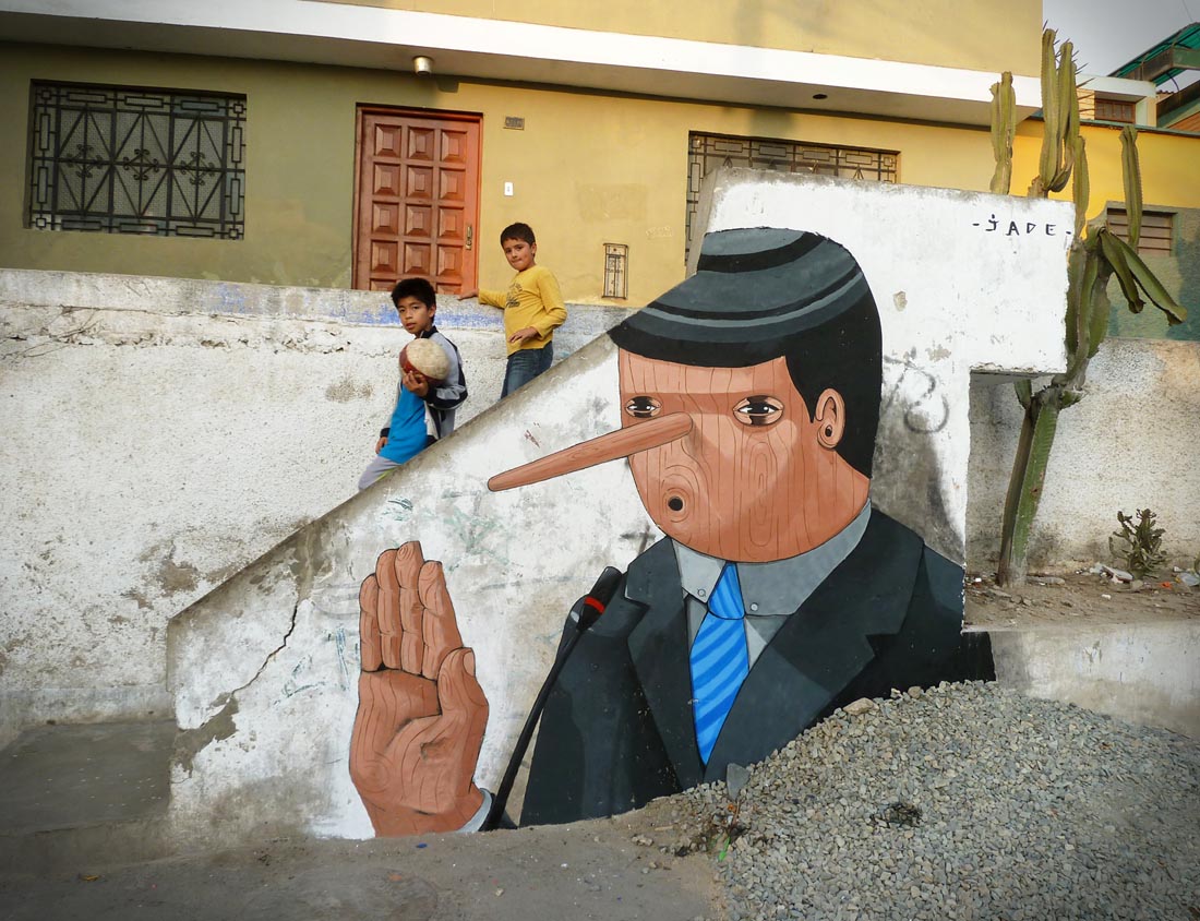 Jonathan Rivera, med artistnavnet Jade, er en av de mest kjente peruanerne graffitikunstnere. Faktisk er det mer korrekte uttrykket muralist, siden han for det meste lager lovlige veggmalerier, som han harmonisk integrerer i miljøet og ofte mottar betaling for. Han ble født i Andesfjellene landsbyen Junín, men siden han var syv måneder gammel har han bodd i Lime. Jade ble interessert i kunst i en alder av elleve og begynte å tegne graffiti i en alder av fjorten. Han meldte seg inn kunstskole, men forlot det veldig snart på grunn av misnøye med skoleverket. Han bestemte seg for å uavhengig utvikle sitt kunstneriske talent på gaten. Siden 1997 har selvlært Jade utviklet seg til en verdenskjent grafiker som med sin graffiti holder vedvarende opp et speil til dagens samfunn.