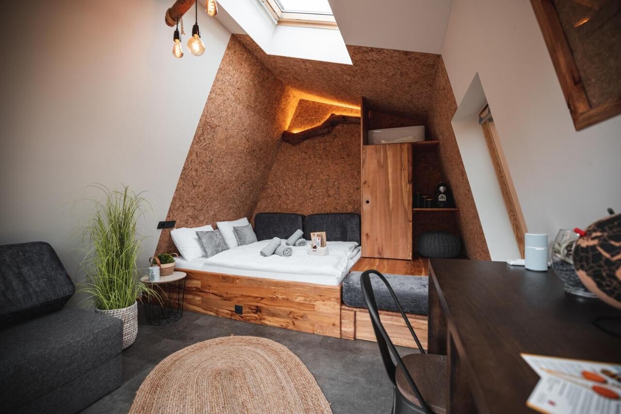 Husene er i sin helhet laget av slovensk tre og isolert med hampfibre, som sikrer et naturlig klima i reirkassene. Interiøret er også designet av lokalt tre, og lampene er laget av epletrær som har tjent og produsert sine rike frukter i flere tiår rett på stedet der husene står i dag.