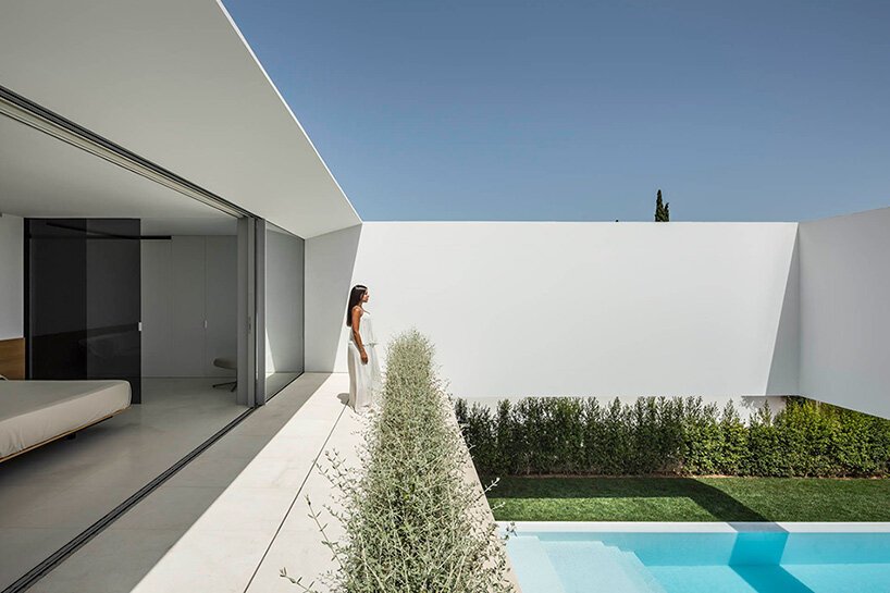 På baksiden av huset over bassenget står en dynamisk, utkraget struktur som gir privatliv og beskyttelse mot den varme sommersolen. Det er oppholdsrom i bagasjerommet, så stuen ligger nær inngangen, og kjøkken og spisestue går over i terrassen på baksiden. Skyvedører i glass gjør at det indre rommet kan utvides til å omfatte bassenget og tilstøtende stue i de varmere månedene. Øvre etasje er mer lukket og inkluderer fire soverom. En trapp forbinder de øverste etasjene med kjelleren, hvor garasje, treningsrom og vaskerom er plassert.