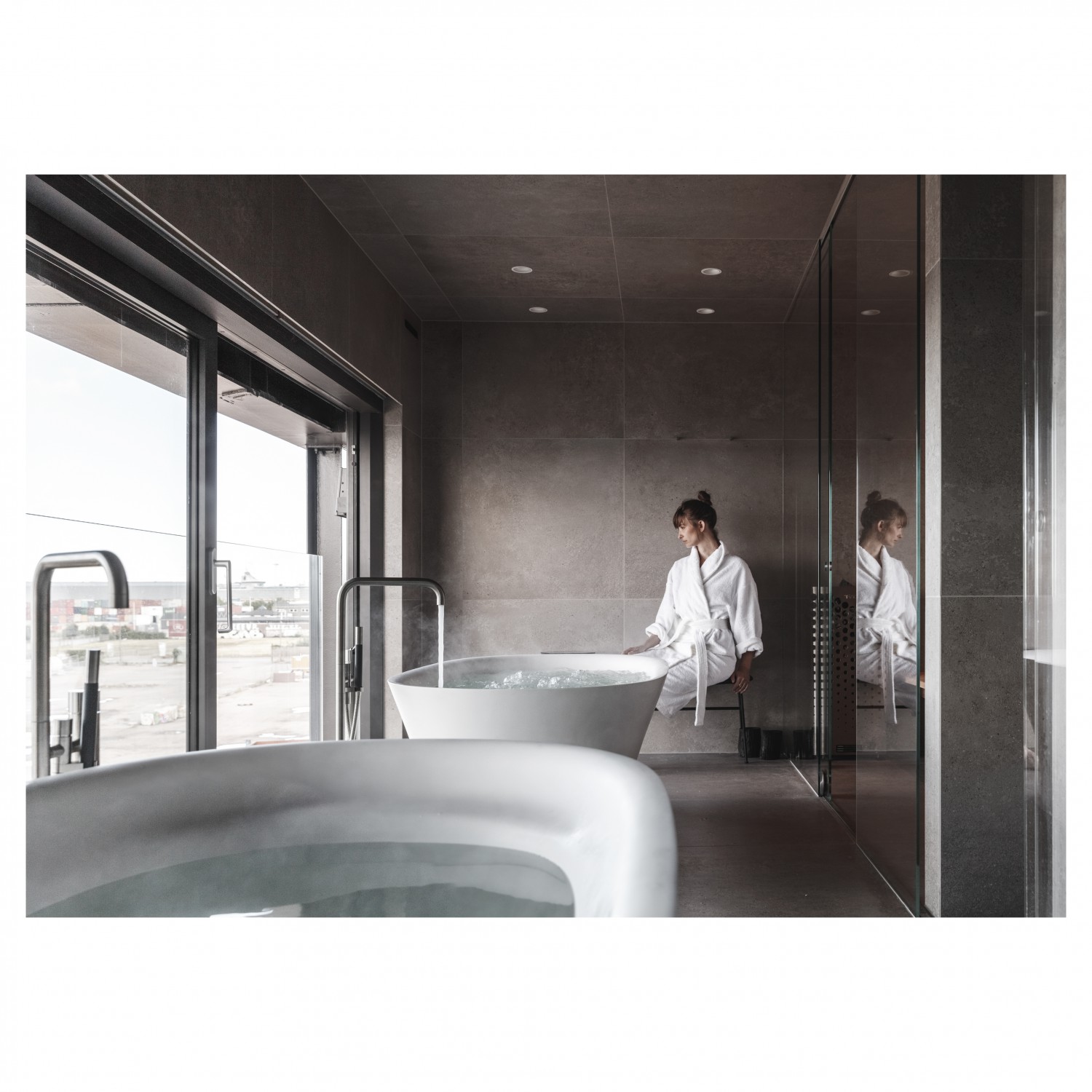 V nadstropju nižje pa se bohoti SPA-rom, hvori od tal do stropa razteza okno, zidovi pa so iz kamna svetlejših barv. Spektakularno.