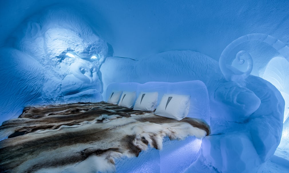 V hotelu se so ledeni apartmaji, ki jih letos krasijo ledene skulpture v obliki pragozda, gorske gorile, severne kraljice og oblakov.