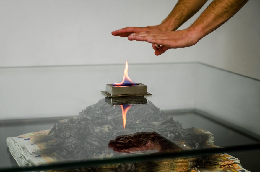 Har du for mye penger? Vet du ikke hvor du skal gå med den? Men kanskje det kan holde deg varm som familien til Pablo Escobar en gang gjorde. Det uvanlige salongbordet er arbeidet til Barcelona-baserte Amarist Studio og Alejandro Monge og er det siste bidraget til deres Too Much?-serie med kunstverk som avslører sårbarhetene til penger og deres sanne verdi. Glassbordet, som rommer en brennende pyramide av 50-eurosedler bak saken, skaper en illusjon om at pengene faktisk brenner ved hjelp av en flamme på toppen.