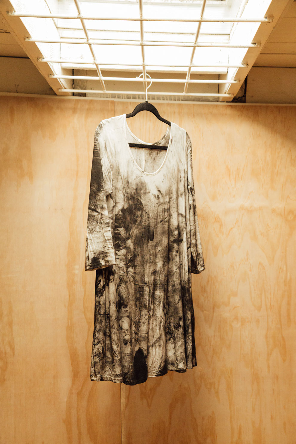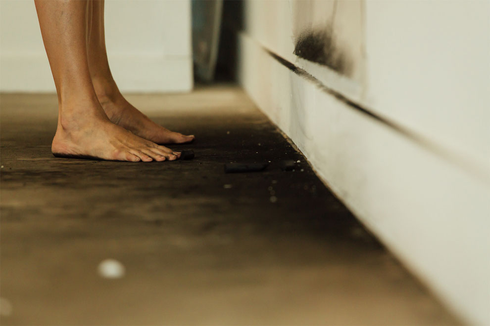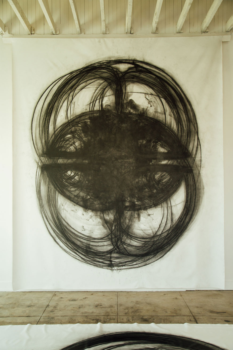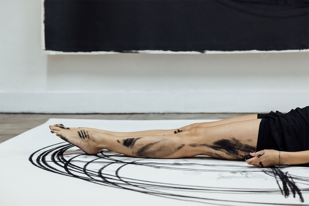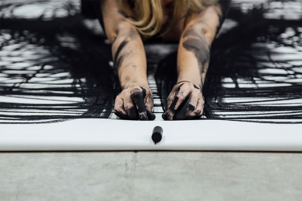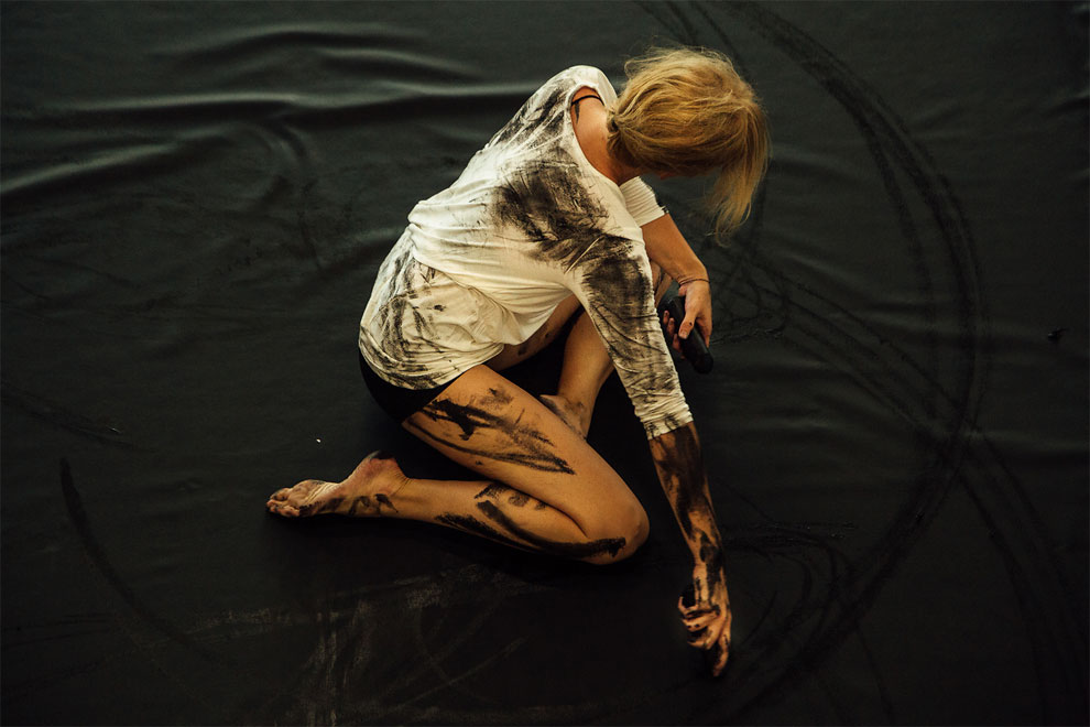Skaper med kull, og resultatet er abstrakt kunst som under danseforestillingen endrer seg fra en dans til en kunstnerisk «aggregert tilstand». Du kan se verkene hennes nedenfor, og hennes ovenfor. danseforestilling, som samtidig er en prosess skapelsen av et kunstnerisk bilde.