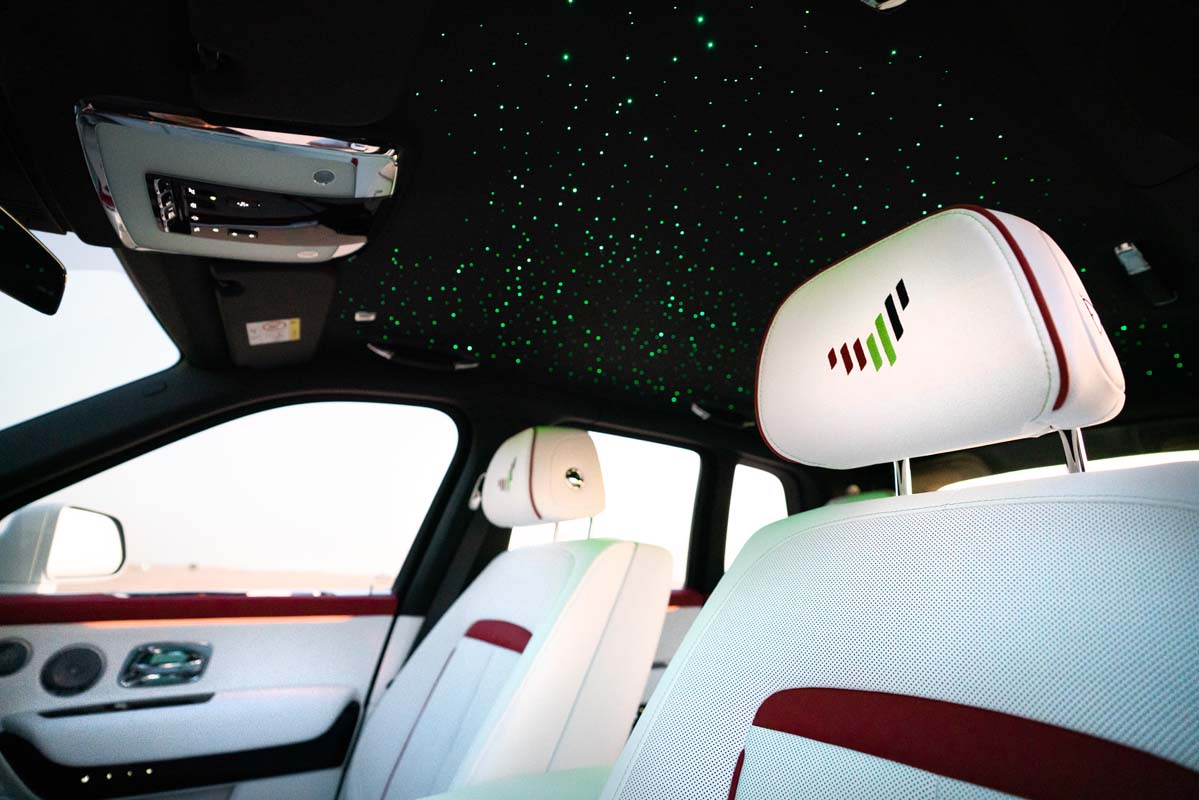 Mange deler av kroppen er belagt med et ``maleri'' som minner oss om granitt, eller rettere sagt marmor. Litt uvanlig for en luksusbil, men likevel blir det bra. Et lignende fargevalg finnes i interiøret, samt en kombinasjon av hvitt og svart skinn. UAE-omrisset er brodert på putene. Mansory tildelte også teknisk Cullinan og har nå 619 hestekrefter og 950 Nm av dreiemoment. Dessverre kjenner vi ikke ytelsestallene, og vi vet heller ikke hvor mye den presenterte prestisje koster.