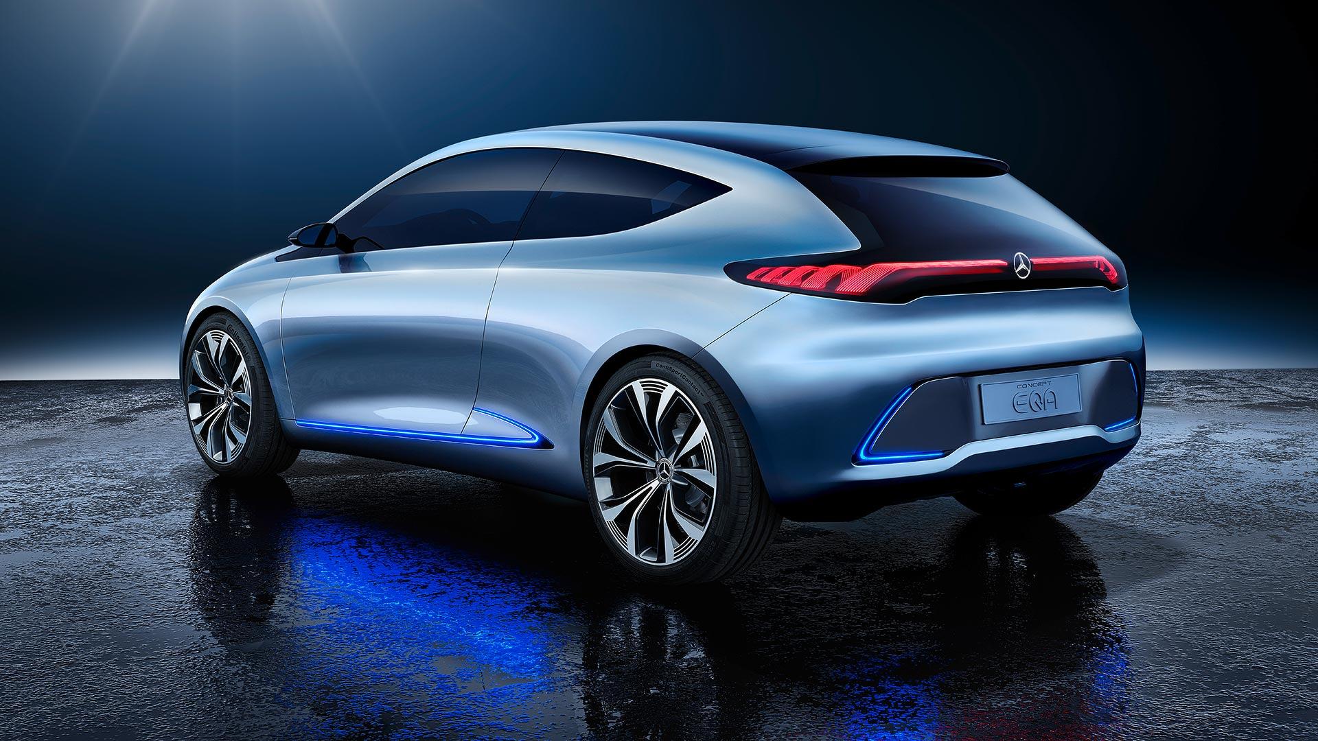Mercedes-Benz EQ A je futurističen trivratni elektrisk bil, ki je poln pametne tehnologije. Oblika je elegant og podolgovata, taka, kot smo jo že videli pri Mercedesovih konceptih. EQ A det har privlačen dizajn, kommer rett iz prihodnosti. Zunanjost premore tudi nekaj visokotehnoloških dodatkov. Prednja maska namreč žari v vodoravni modri črti, ko se vozimo v voznem načinu Sport. Ko preklopimo v vozni način Sport Plus, modra črta izgine, namesto nje pa zažarijo pokonci postavljene rdeče črte, ki ponazarjajo tako imenovani “grille“. Koncept EQ A se je avbrutt trenutno zelo priljubljenim LED-žarometom in si namesto njih nadel frontlykter, ki jih osvetljujejo laserska vlakna.