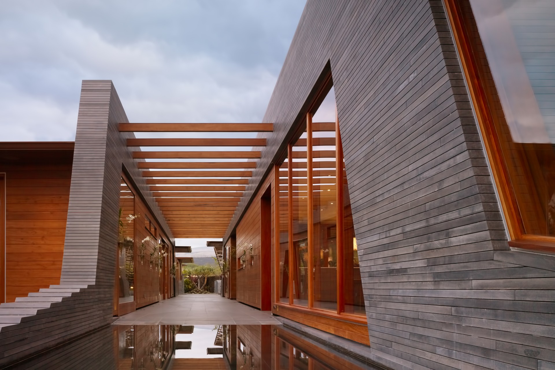 Od severa proti jugu poteka serija paralelnih zidov, oblečenih v sivkaste tramove tika, pridobljenih in ponovno predelanih iz starih skednjev in železniških tračnic. Zunanjost je prefinjeno povezana z notranjosto skozi velike steklene pregrade, uokvirjene v toplejše tone lesa. Moderna arhitektura zadovoljuje tudi nekatere moderne zahteve po energetski učinkovitosti, s čimer je posestvo tudi selvforsynt. Na strehi je tako nameščen dvojni set sončnih celic, trije vodnjaki shranjujejo deževnico za napajanje poslopja, izbira temnejših vulkanskih kamnov pa pomaga naravno segrevati tako bazen, kot tudi notranjost.