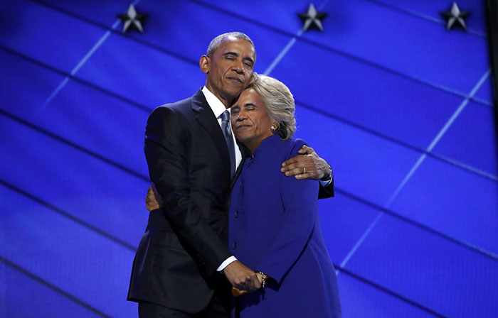 Obamas støtte til Clinton vi vil derfor bli husket av helt feil grunn. Det ble en uventet klem målet for en fotomontasje og kom dermed enda mer merkelig ut. Slik at du ikke tror at verden bare gjør narr av Melania Trump og Donald Trump.