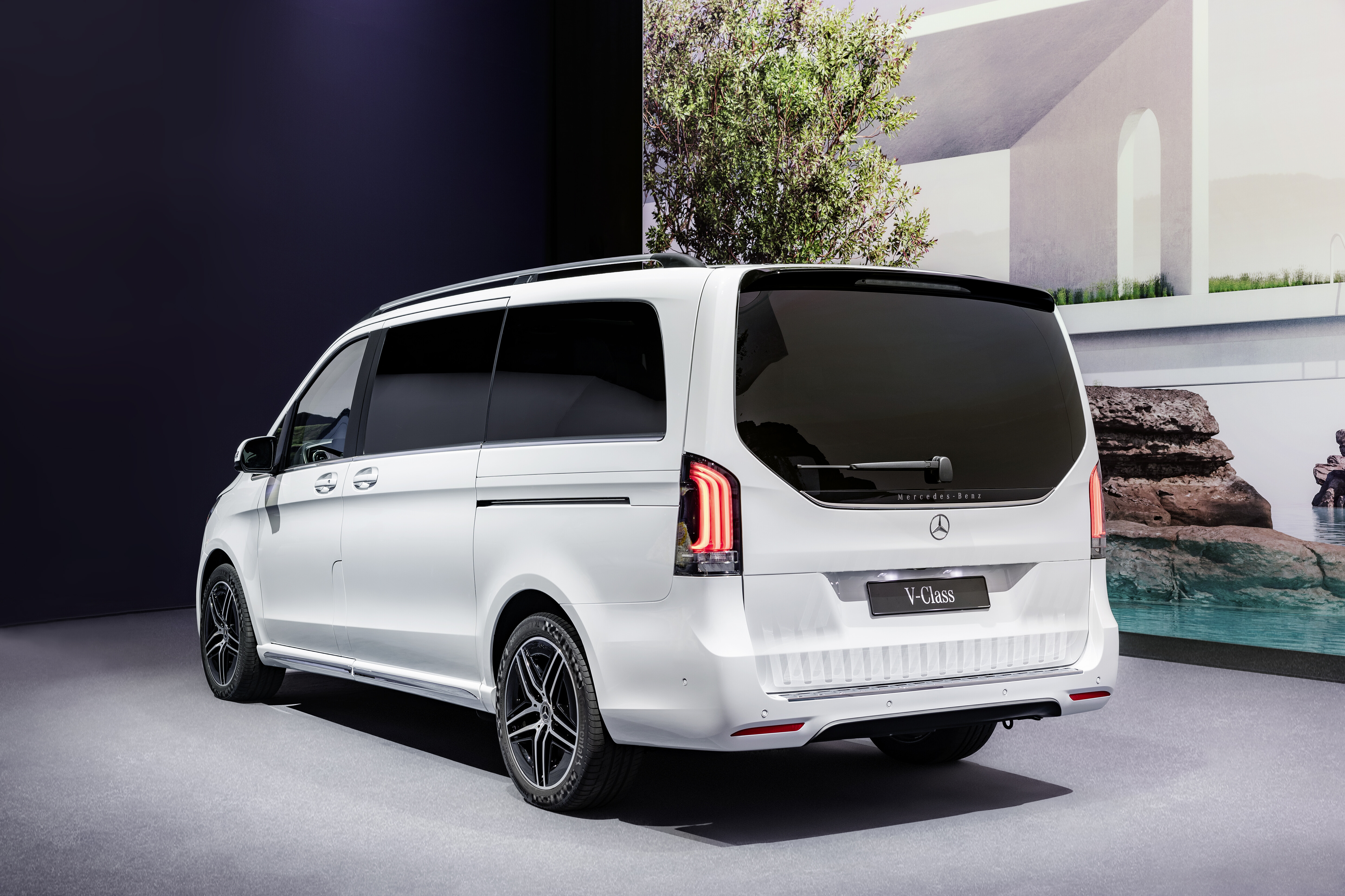 V-klasse, V-Klasse Marco Polo, Vito, e-Vito og EQV mottar alle oppdateringer som inkluderer en rekke trekantede stjerner innebygd i grillen, som speiler nyere biler som den nye E-Klasse. V-Klasse / V-Klasse Marco Polo og EQV har nå en opplyst LED-kontur på masken, mens den prestisjetunge modellen V-klasse Eksklusiv mottar for første gang klassisk stjerne, montert på lokket. Så se på V-Klasse fra 2024