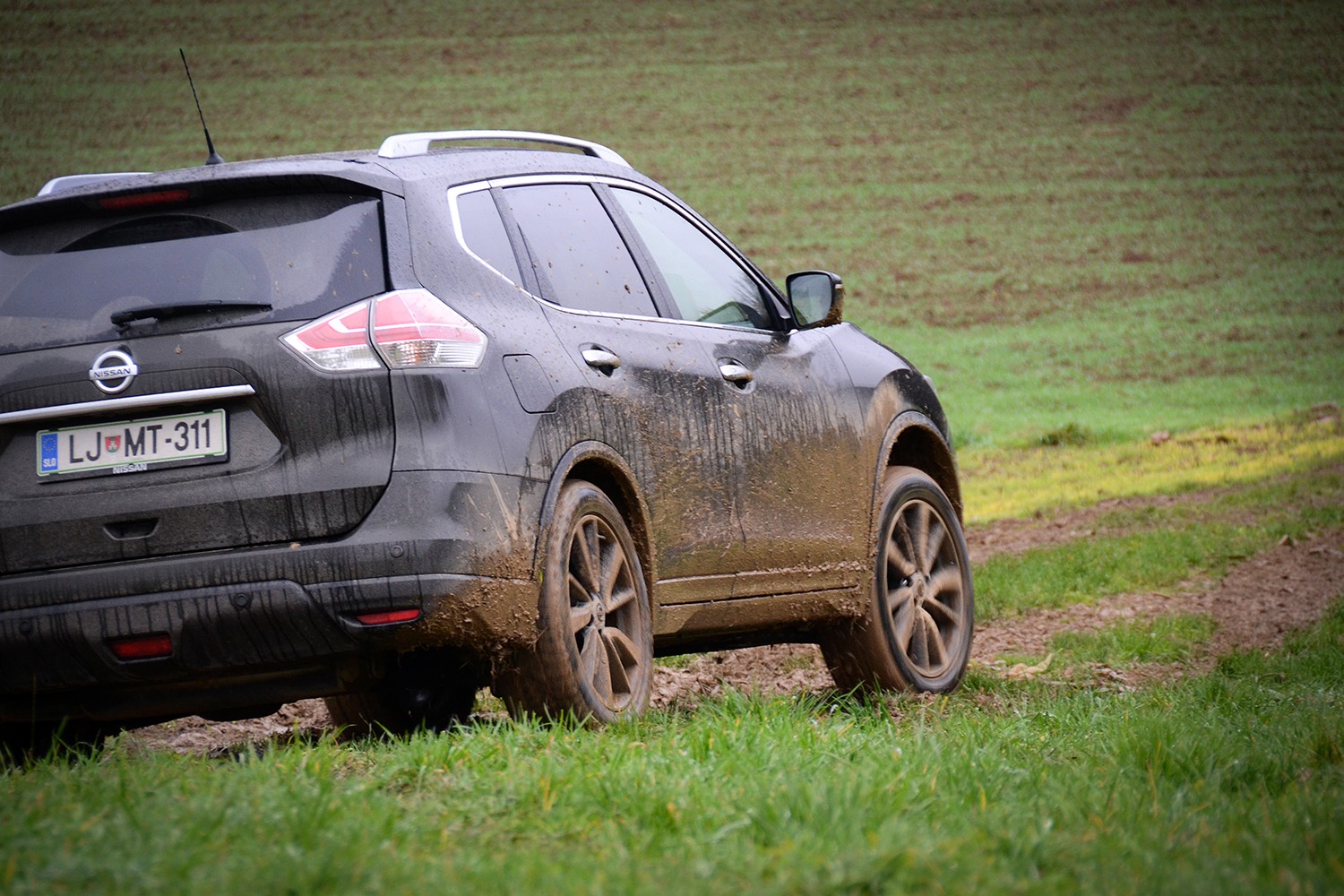 Firehjulstrekk je tako kot pri predhodniku električni priključljivi, kar pomeni, da sta v osnovi gnani le prednji kolesi, po potrebi pa (v načinu auto) elektronska zapora diferenciala potrebno količino navora pošlje tudi zadnjemu kolesnemu paru. Voznik pa lahko preko vrtljivega gumba pogon tudi zaklene, v pomoč pa so mu tudi elektronska pomagala za varen spust po klancu in speljevanje vkreber. Z 21 centimetrskim odmikom od tal to pomeni, daje zmožen premagovati tudi težje prevozne terene, vendar ga kot v uvodu rečeno malce zaustavljata cestna obutev in 19-palčna platišča, kakor tudi dejstvo, da večina ne bo želela niti umazati svojega x-traila, kar šele poizkušati srečati meje njegovih terenskih zmogljivosti.