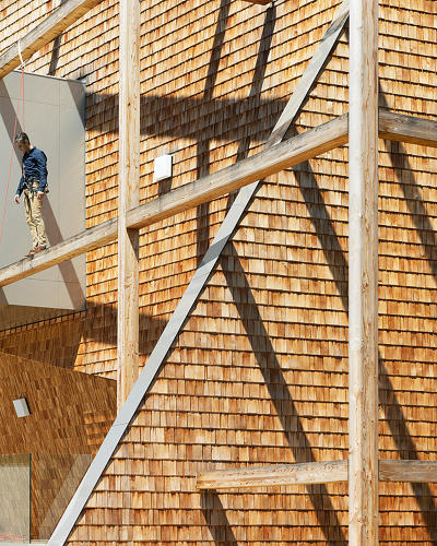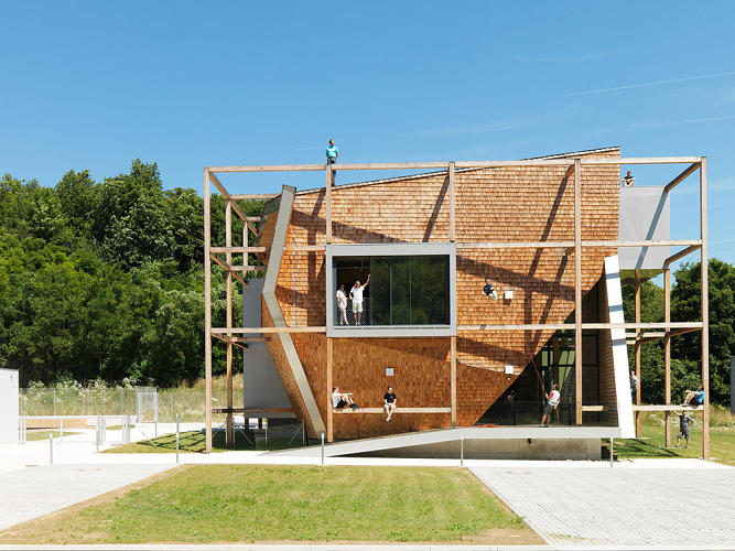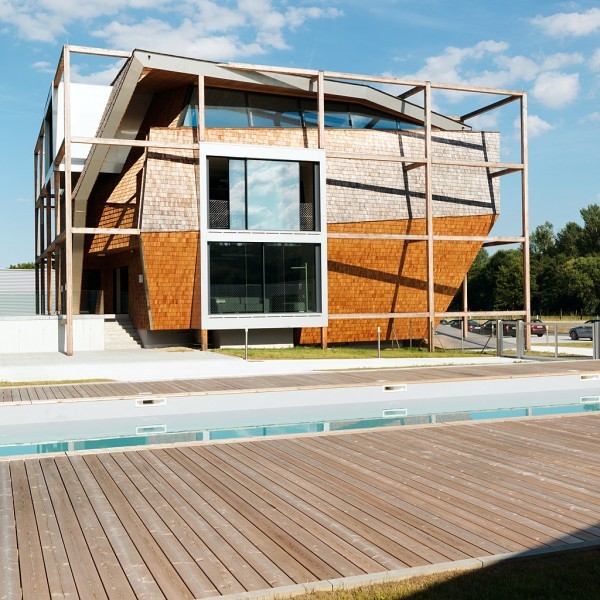 Večina ljudi v današnjem času preživi večji del dneva v pisarni, ki pa je (še) ne doživljamo kot bivanjsko okolje. V zadnjem času arhitekti namenjajo več pozornosti temu, da službeno okolje oblikujejo v bolj življenjskega – z dodajanjem rastlinja, igral in udobnih zof. Avtorji, dunajski arhitekturni biro Heri & Sally so stopili še korak dlje in z zasnovo popolnoma zabrisali mejo med delavnim in prostim časom. Že v sprejemnici naletimo na trinadstropno plezalno steno, prostori za sproščanje pa so razporejeni po celotni stavbi. Uslužbenci lahko med delavnim časom obiščejo treningsstudioet, kuhajo v priročni kuhinji ali pa si v spalni niši celo privoščijo ettermiddagshvile. Pred stavbo Office off trenutno urejajo velik vrt, v katerem bodo kmalu prebivale tudi kokoši, ovce in race. Poleg svojih zanimivih funkcij je zgradba tudi trajnostno zasnovana, zgrajena je namreč iz naravnega lesa, na strehi ima sončne celice, se naravno hladi in ima zbiralnike za deževnico. Pričujoča zgradba je eden izmed boljših primerov tega, kako bomo živeli v prihodnosti!