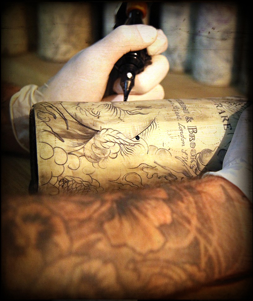 Lastnik pariškega tatu studia Le Sphinx Sébastien Mathieu je za priznano znamko žlahtne pijače J&B ustvaril prav posebni videz. Steklenice, odete v trpežni lateks kožne barve, je okrasil s pomočjo sodobne tehnike tetoviranja z električnimi iglami. Za končanje vsake barvite in nadvse realistične mojstrovine je tako potreboval potrpežljivih 20 ur dela.